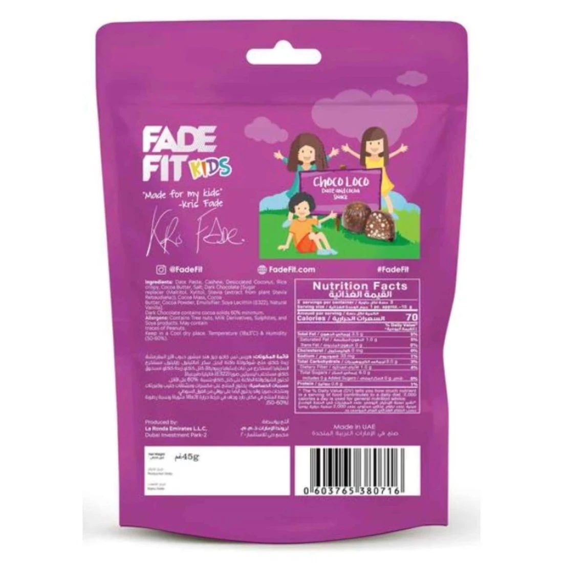 Fade Fit Kids Choco Loco Chocolates are a delicious treat that kids will love. These chocolates are made with real cocoa and have a rich chocolatey flavour. Each 35g bar is the perfect size for snacking and is a great option for packed lunches or as an after-school treat. The Choco Loco flavour is a combination of smooth milk chocolate and a hint of hazelnut creating a delicious and indulgent snack. These chocolates are also free from artificial colours and flavours making them a healthier option for kids.
