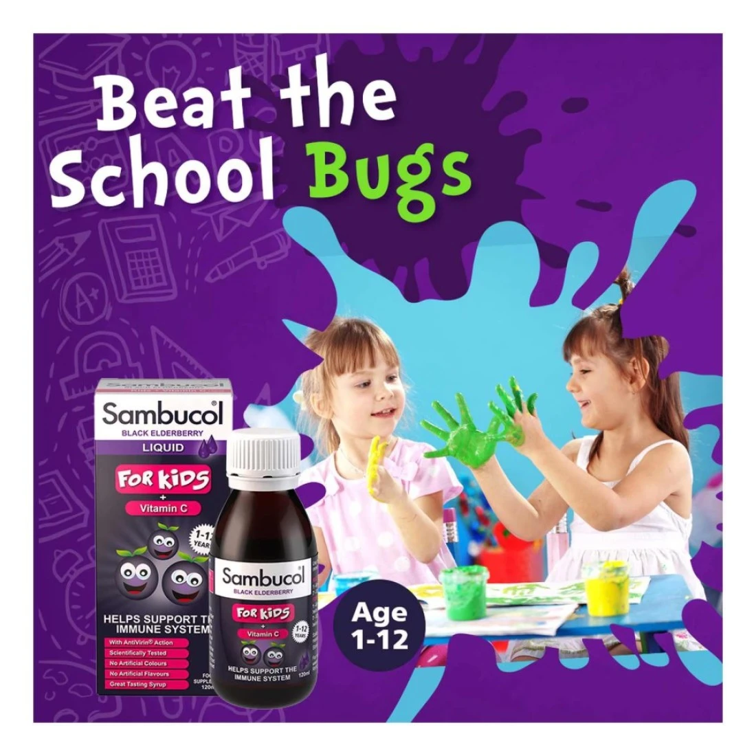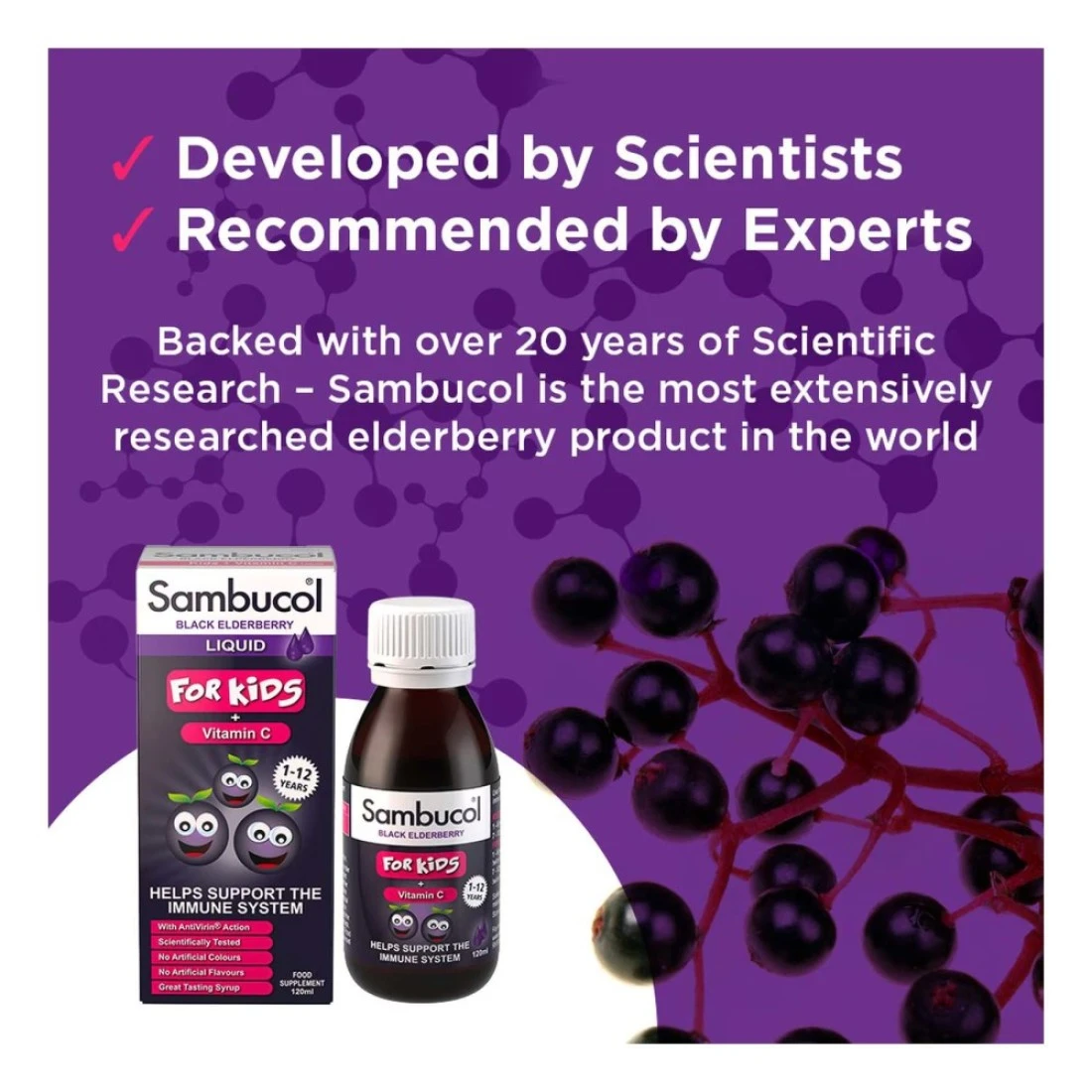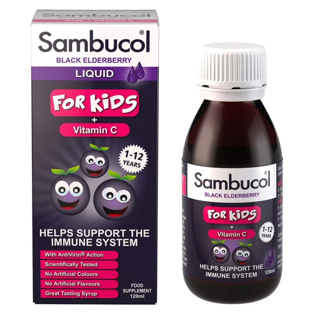 Sambucol Kids Vitamin C Syrup is a specially formulated dietary supplement for children. Packed with the goodness of Vitamin C it helps in boosting the immune system and protecting against common colds and flu. The syrup contains black elderberry extract known for its antioxidant properties that aid in enhancing the body's natural defense mechanisms. The delicious berry flavour makes it a favourite among children making it easier to incorporate into their daily routine. Sambucol Kids Vitamin C Syrup is suitable for children aged 2 years and above and is free from artificial colours gluten and lactose making it a safe and effective choice for kids' health.