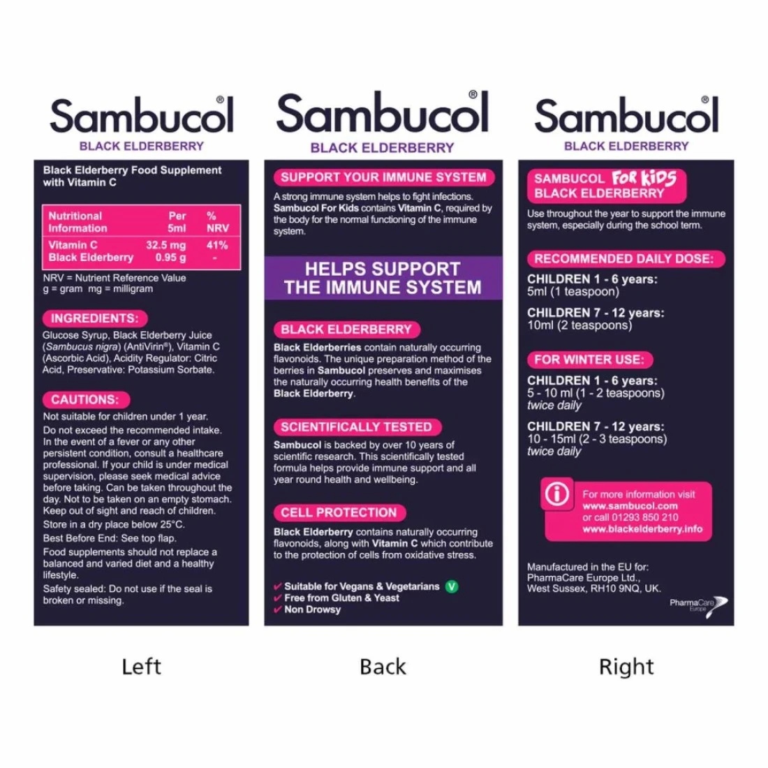 ingredients : Glucose Syrup, Black Elderberry Juice (Sambucus nigra), Vitamin C (Ascorbic Acid), Acidity Regulator: Citric Acid, Preservative: Potassium Sorbate.