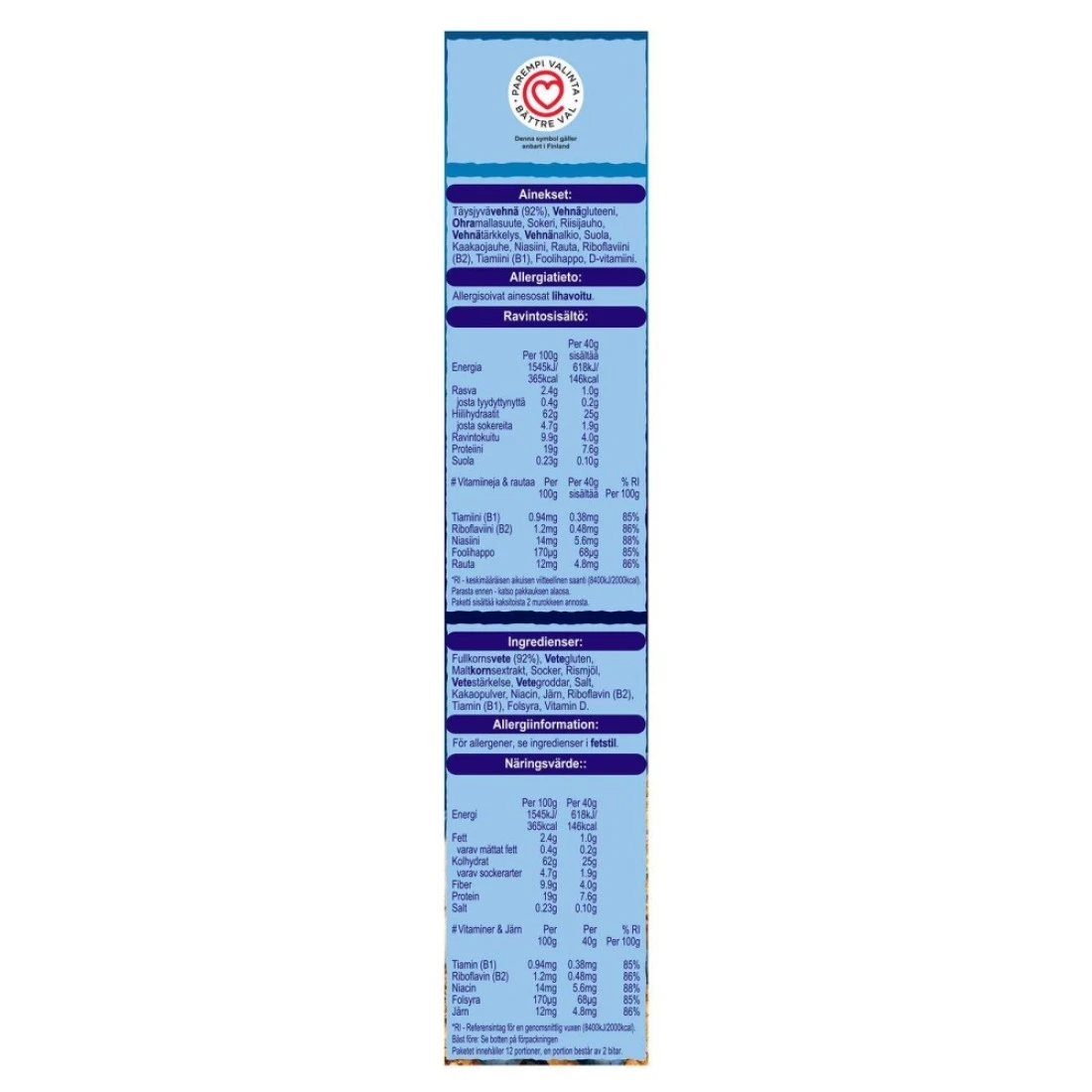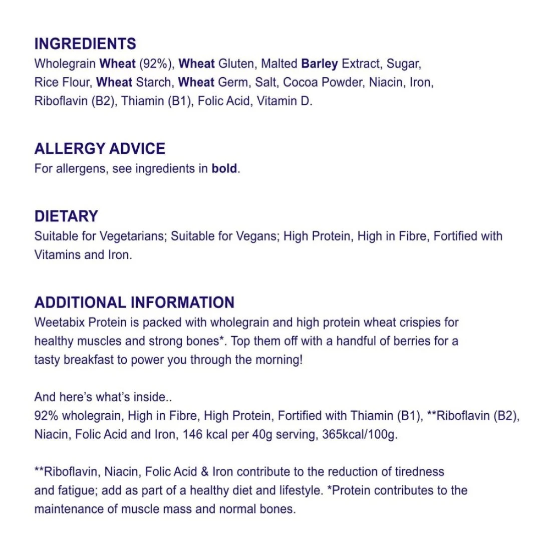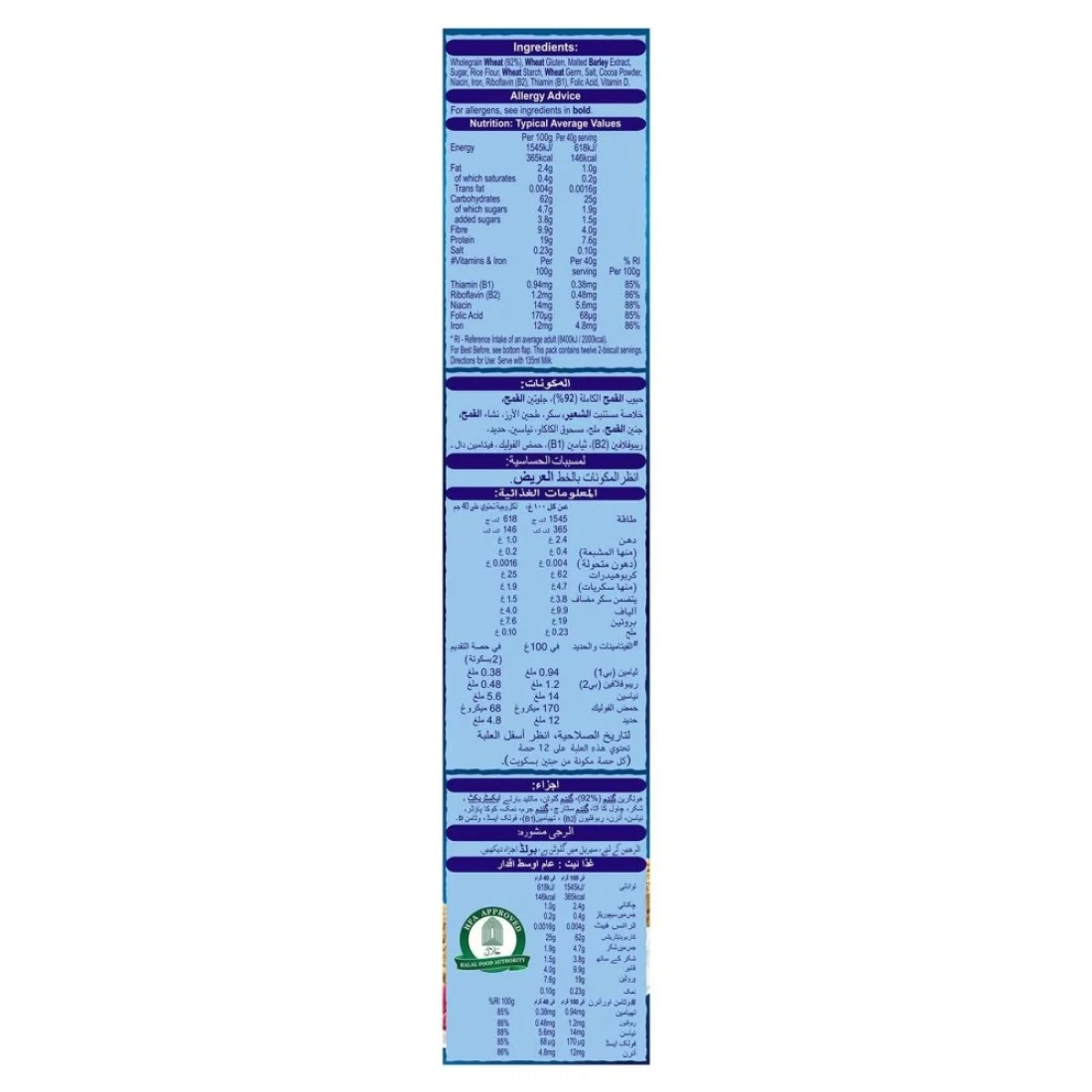 ingredients : Wholegrain Wheat (92%), Wheat Gluten, Malted Barley Extract, Sugar,rice Flour, Wheat Starch, Wheat Germ, Salt, Cocoa Powder, Niacin, Iron, Riboflavin (B2), Thiamine (B1), Folic Acid, Vitamin D