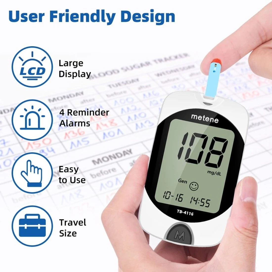 MeteneTD4116 Blood Glucose Monitor Kit 100 Glucometer Strips 100 Lancets 1 Blood Sugar Monitor Blood Sugar Test Kit with Control Solution Lancing Device No Coding Large Display