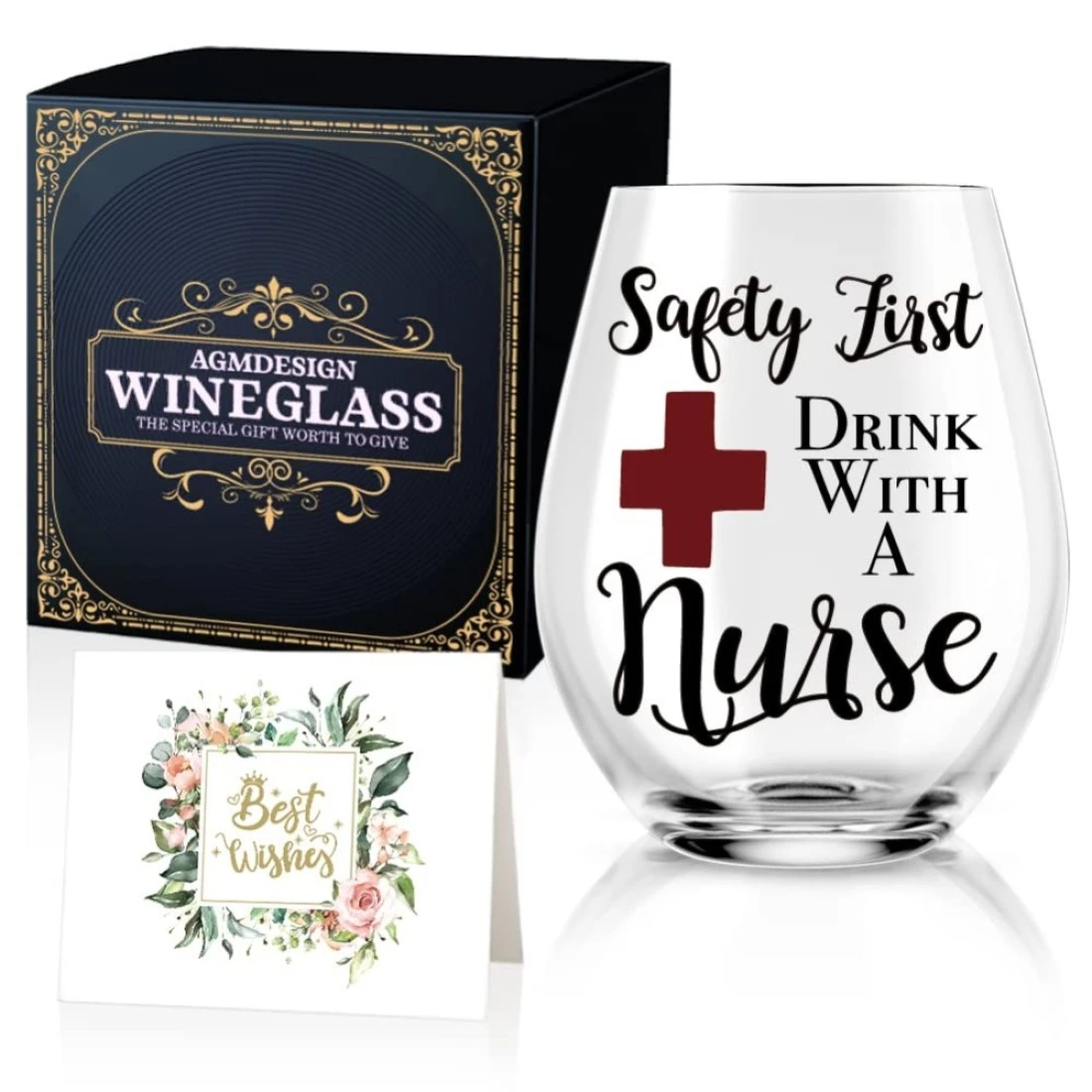 AGMDESIGN Safety First Drink With A Nurse Wine Glass With Gift Box, Funny Nurse Gifts For Nurses, Doctor, Dentist, Nursing Student, Physician, Practitioner, Coworker, Nurses Day Nurse Graduation Gifts