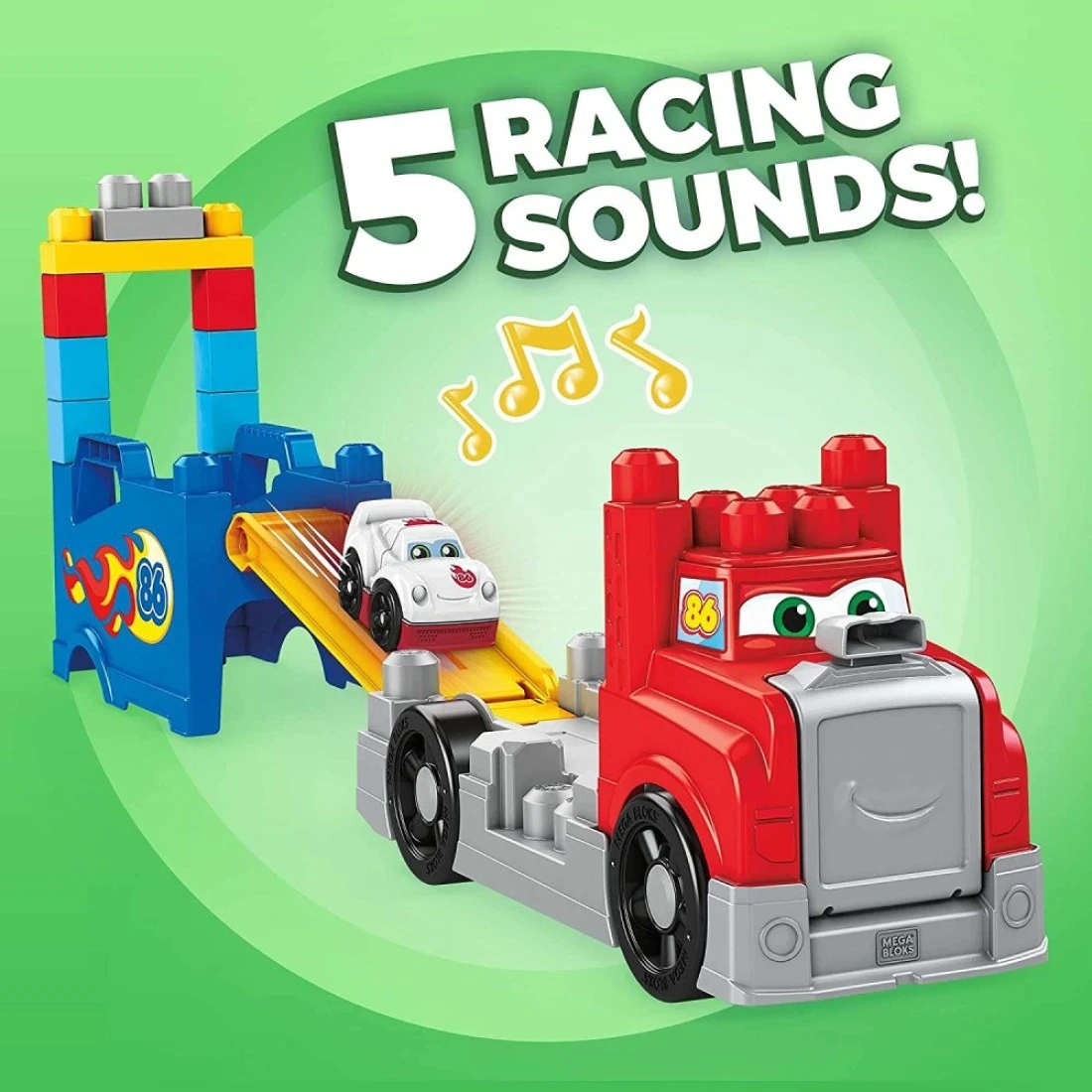 Open the big rig to roll out a buildable race car with real racing sounds! Little racing fans can zoom into adventure with this big rig truck and a buildable race car that makes real racing sounds! Reconfigure the big rig and use the truck's body as a base for the included building blocks and race track pieces. Arrange the ramp different ways to build all kinds of racing stunts. Send the race car down the track to the finish line, then pack up and haul out when you put everything away inside the rig until the next race! Ideal for ages 1 to 5