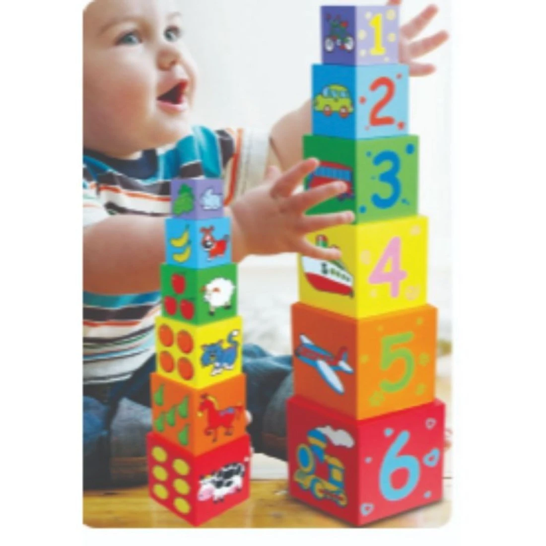 6 colorful wooden blocks printed by hand with animals, vehicles, fruits and numbers can be stacked and nested.