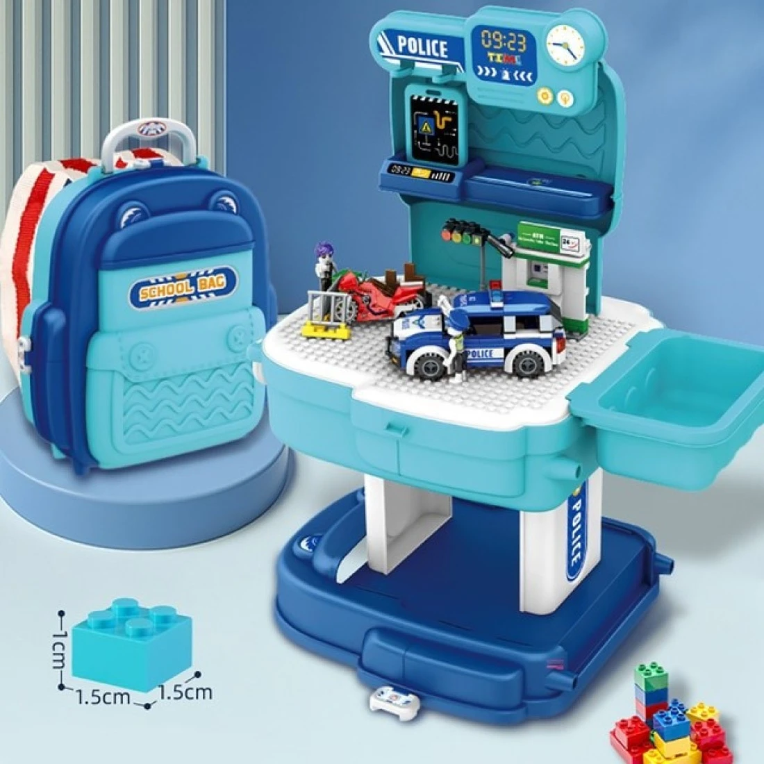 Little Story ROLE PLAY POLICE STATION WITH POLICE CAR AND BLOCK TOY SET SCHOOL BAG (219 Pcs) - Blue, 2-IN-1 Mode
