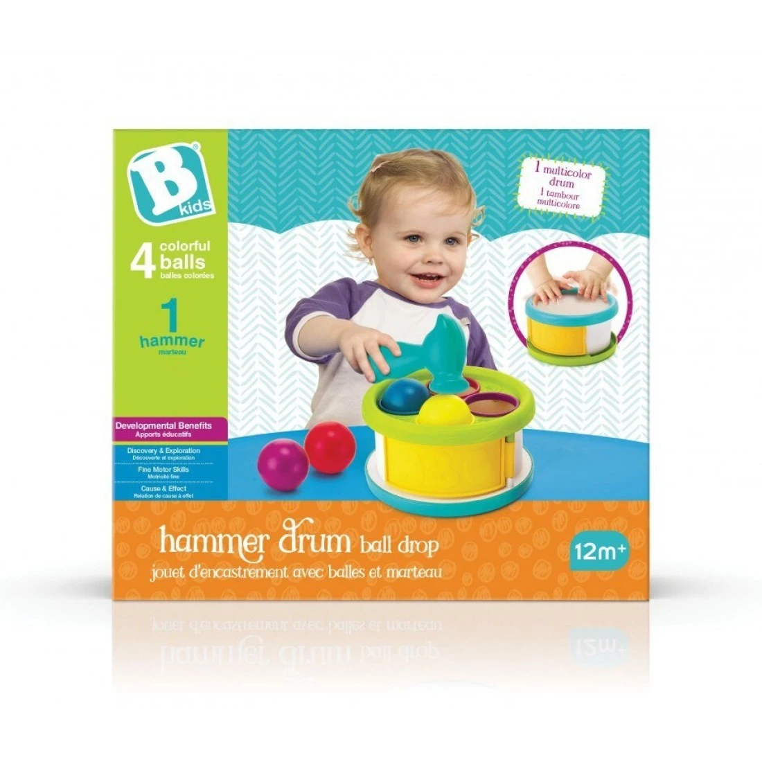 B - Kids Hammer Drum Ball Drop draws out the natural drummer in infants and lets them hammer balls into the side of the drum.Drum opens up to access balls and allows drumming on the other side using the hammer