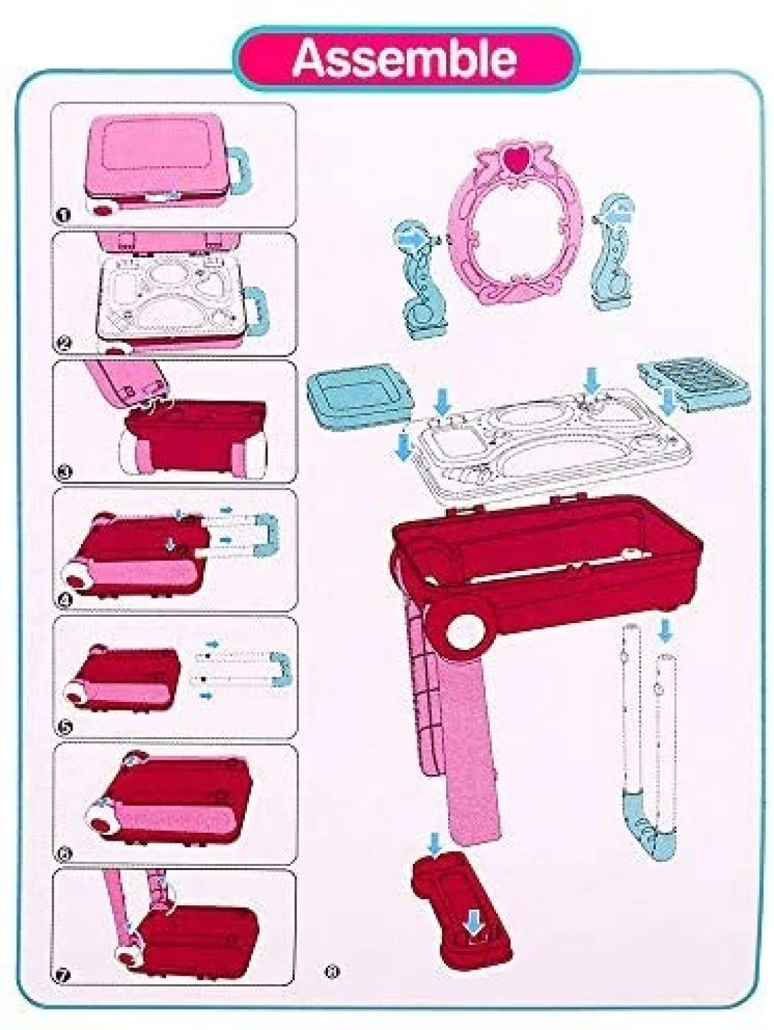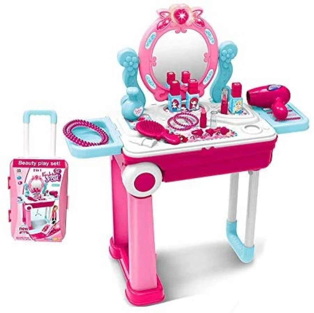 2 in 1 Pretend Play Kids Vanity Table and Chair Beauty Mirror and Accessories Play Set with Trolley Fashion Makeup Accessories for Girls