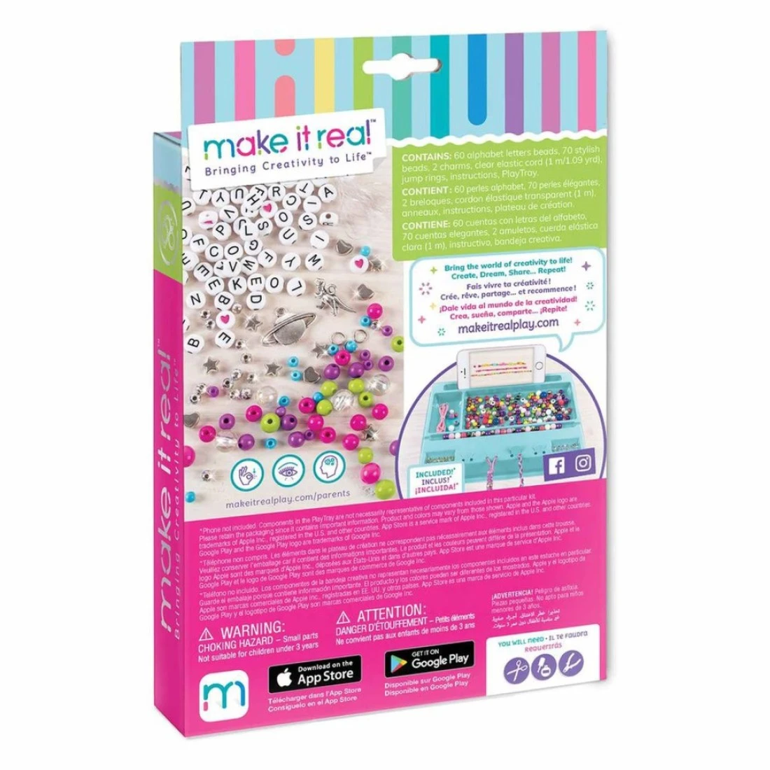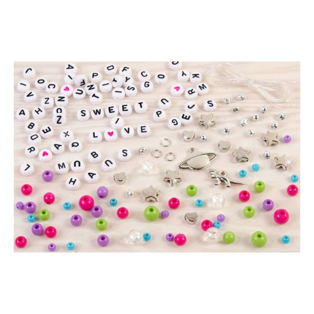 - Kit includes 60 alphabet letter beads, 70 stylish beads, 2 charms, clear elastic cord (1 m), jump rings, instructions, PlayTray