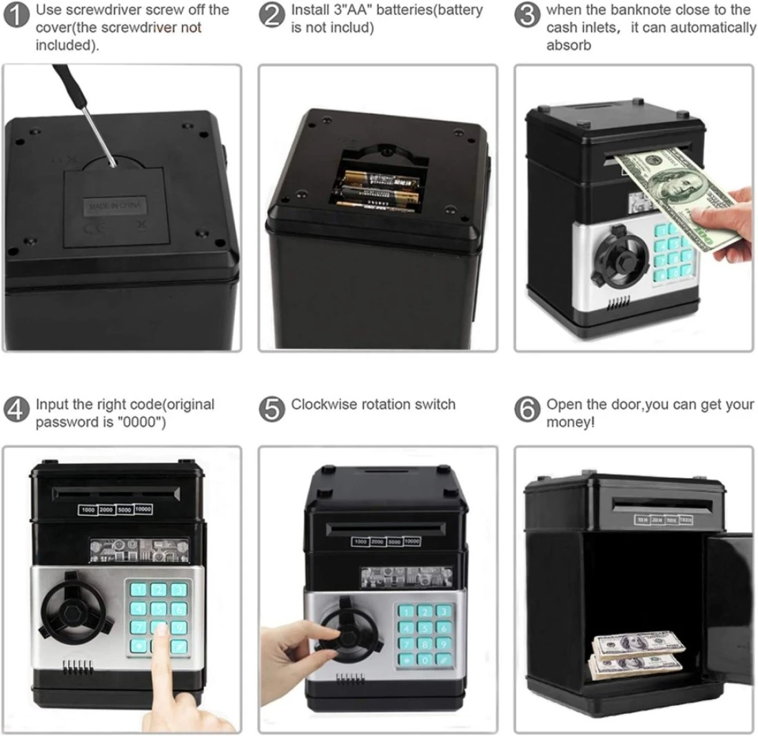 Password Safe Money Box:Enter the 4 original password(default: 0000, Changable passwords as you like), the green light will be on, the ATM can be opened. If you enter the wrong password, the red light will turn on and the sound of "PLEASE TRY AGAIN" will prompt you (you can't open it,if the password it's wrong)