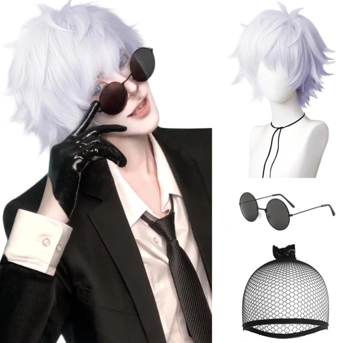 Anogol Hair Cap+(1 Black Glasses) Satoru Gojo Cosplay Wig Short Silver Fluffy Wig for Jujutsu Kaisen Cosplay Silver Mix Light Purple Men Synthetic Hair with Bangs Costume Wig for Halloween Party Anime