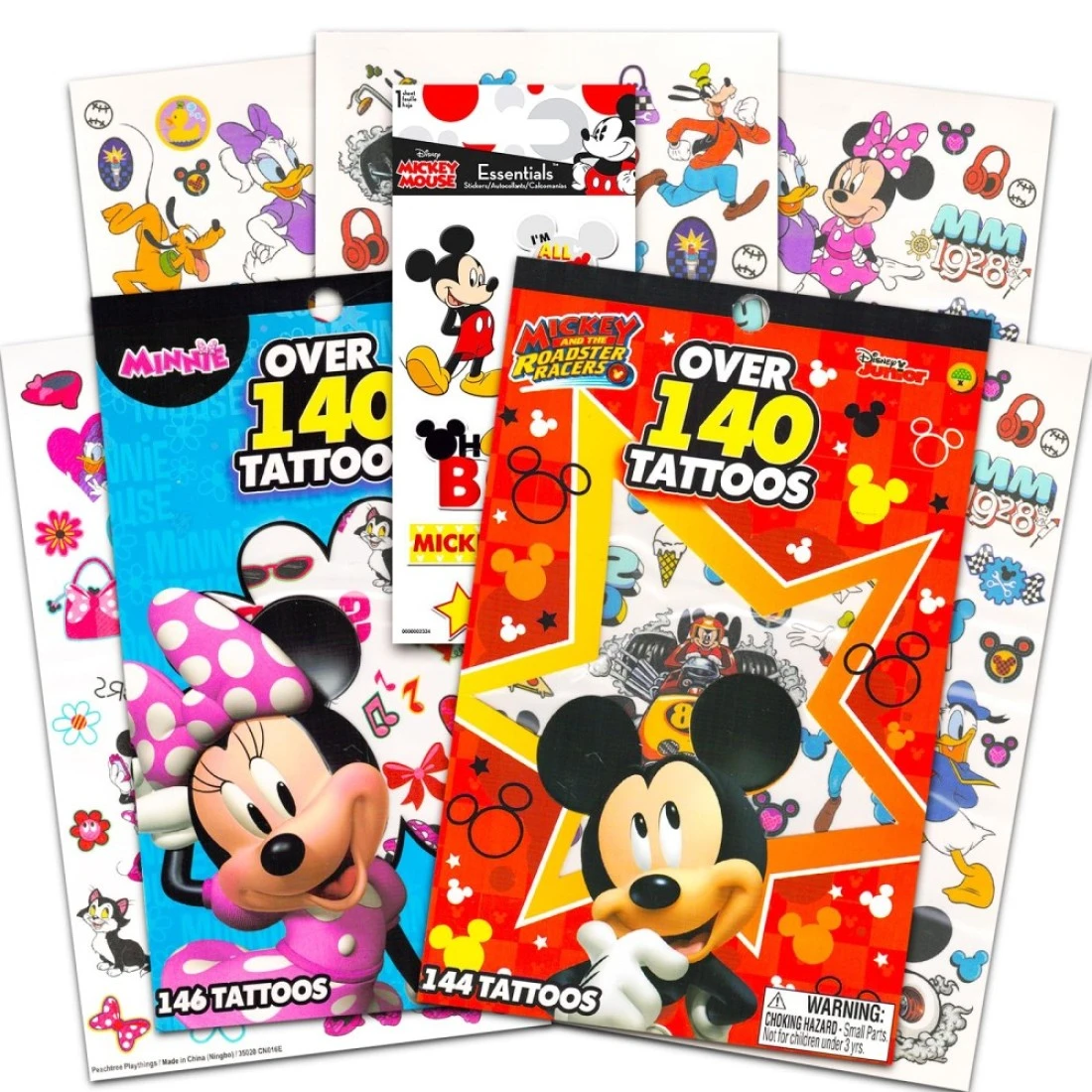 Disney Mickey Mouse and Minnie Mouse Temporary Tattoos Party Favors Pack ~ Bundle Includes 140 Disney Minnie Tattoos and 140 Mickey Mouse Tattoos for Kids Toddlers Boys Girls Plus Stickers Mickey Mouse Party Favors, Includes 140 Disney Minnie Mouse temporary tattoos, 140 Mickey Mouse tattoos., and a bonus sheet of Mickey and the Roadster Racers stickers!, Perfect to hand out as party favors at Minnie Mouse birthday parties and Mickey Mouse birthday parties., These Mickey Mouse and Minnie Mouse temporary tattoos are fun, fast to apply, easy to remove. FD&C Approved Ingredients. The perfect Disney party activity., Great fun for any Disney Mickey Mouse and Minnie Mouse fan! Perfect as Mickey Mouse party supplies, Minnie Mouse party supplies, party favors, reward tattoos, party decorations, motivational tattoos, and more!