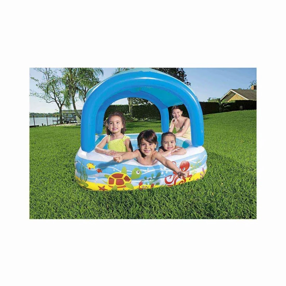 - Colorful play pool with detachable sunshade canopy