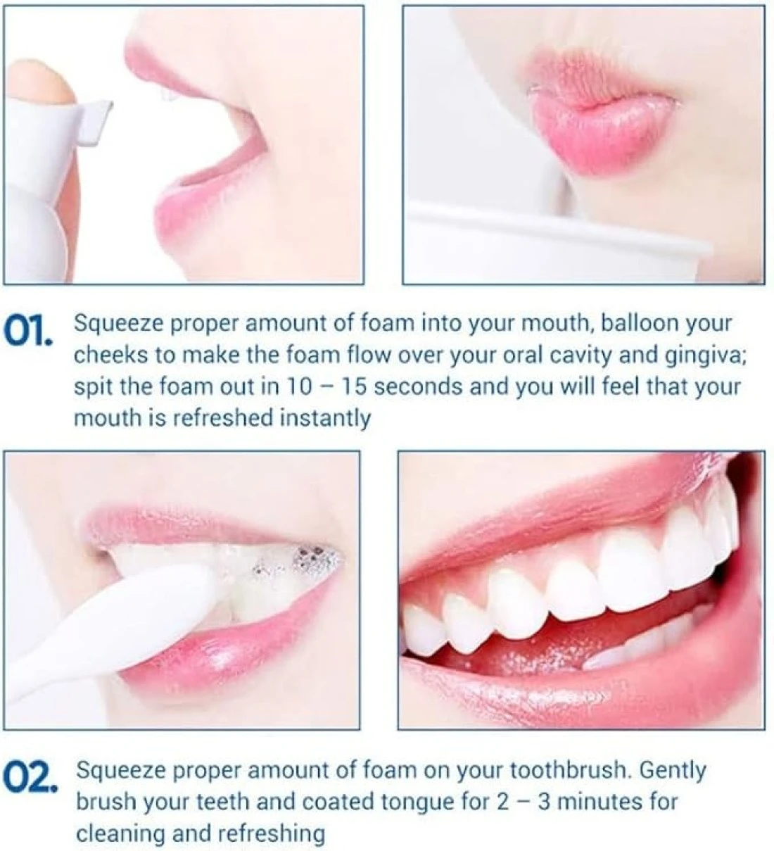 Step 1 - Squeeze proper amount of foam into your mouth, balloon your cheeks to make the foam flow over your oral cavity and gingiva; spit the foam out in 10-15 seconds and you will feel that your mouth is refreshed instantly