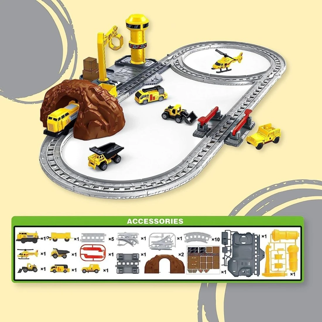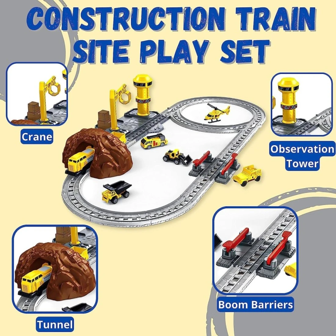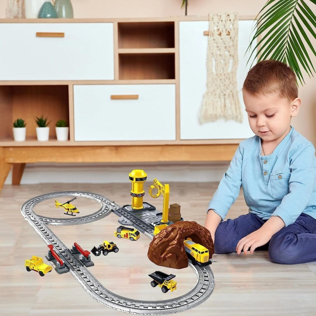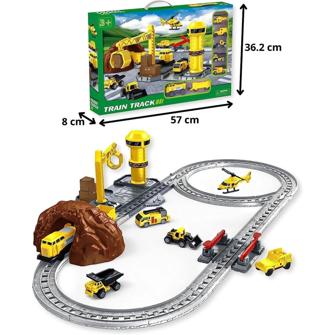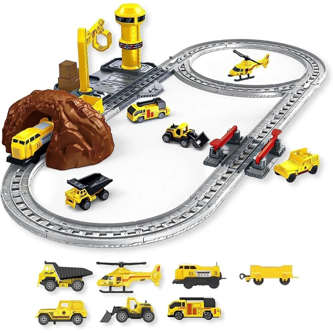 Whats inside the box?: A one-of-a-kind train locomotive playset for kids which has fully functioning train engines ready to go to transport people and goods. Your kid now manages a train station together with construction vehicles to move transport and help with construction. With a helicopter, a functioning control tower, and an underground tunnel it is a really fun-packed play set.
