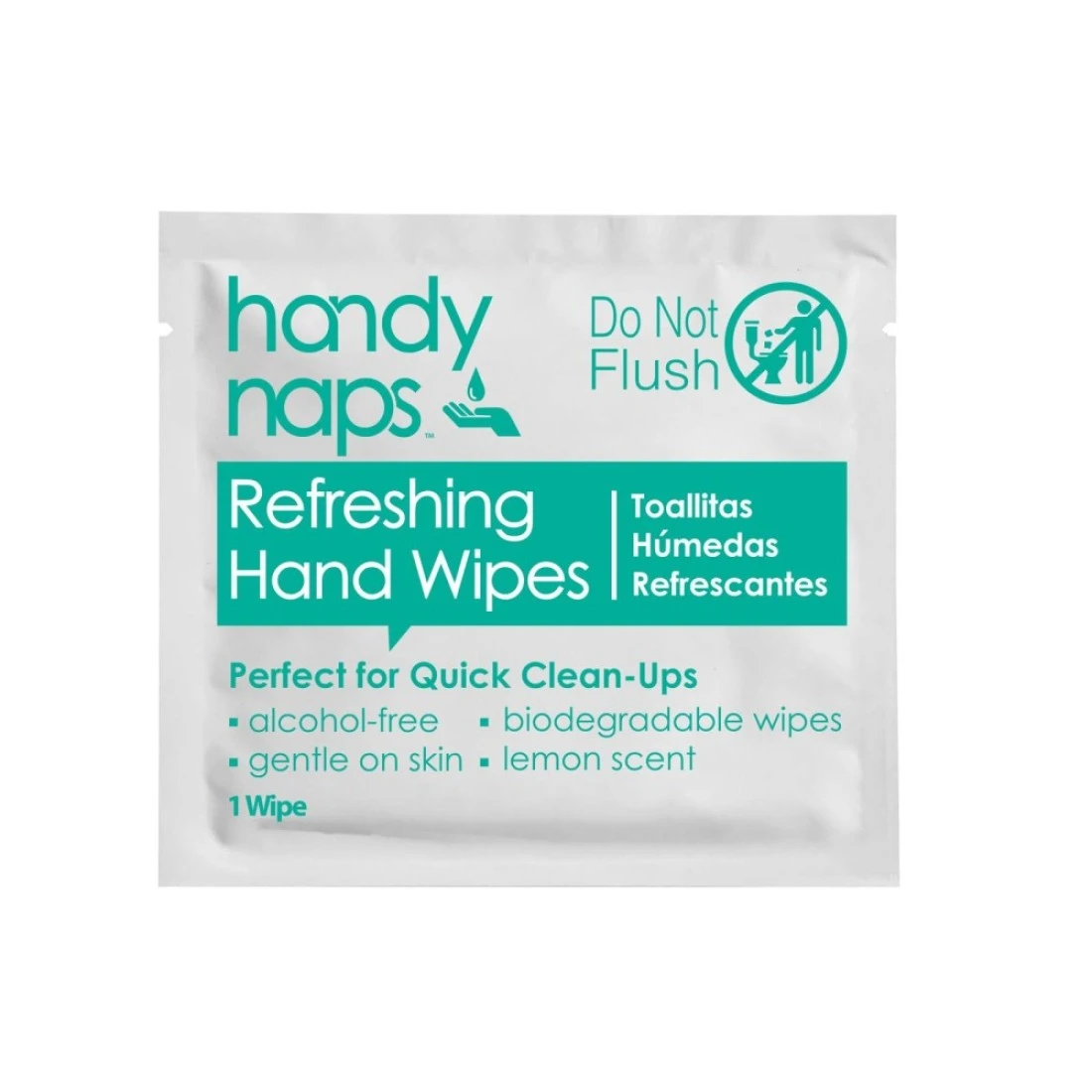 REFRESH ANYTIME with HandyNaps pre-moistened hand wipes with a lemon scent. Gentle on the skin while cleansing. Take these wet wipes with you to keep your hands feel fresh, not sticky, or covered in dirt and grime., QUICK CLEAN-UPS - Use our refreshing lemon fresh cleansing wipes to keep your hands washed before and after meals, at the movies, after changing diapers, and on the go. Its economical design and effectiveness also make it a restaurant favorite., NO HARSH CHEMICALS - HandyNaps offer gentle yet effective wipes for adults and safe for kids. These cleaning wipes are alcohol-free - hydrating and non-drying. Perfect for everyday use., EASY TO CARRY - Keep these disposable wipes as part of your everyday and travel essentials. These travel wipes are packed individually to keep the hand wipes from drying and easily fit purses and bags., WE KNOW WIPES - We started as a small company in a garage-sized facility, producing individually packaged, microwavable wet wipes ('Oshibori') for restaurants. Diamond Wipes International has since grown and is now the largest wet wipe manufacturer to the West of the Rockies - the choice of a wide range of industries and markets.