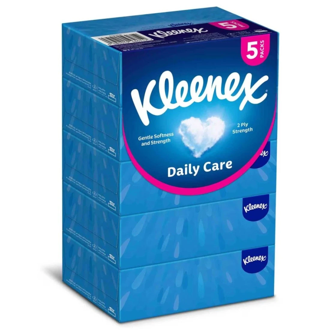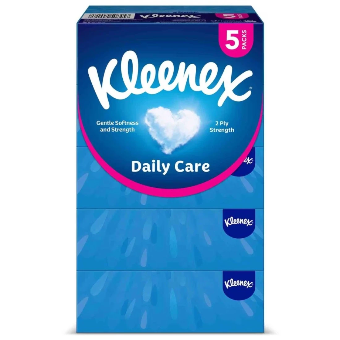 Kleenex Daily Care Facial Tissue Box is a pack of 5 boxes, each containing 150 2-ply tissues. These soft and gentle tissues are designed for everyday use and provide comfort and care for your skin.