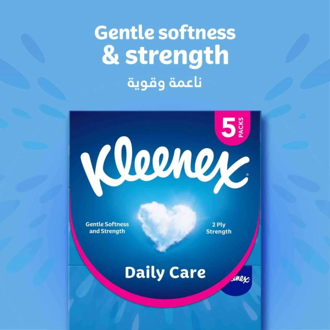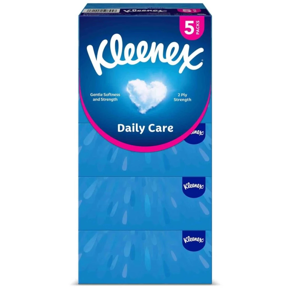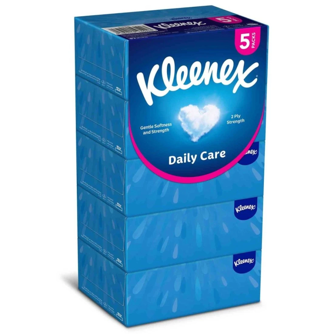 Kleenex Daily Care Facial Tissue Box is a pack of 5 boxes, each containing 190 2-ply tissues. These soft and gentle tissues are designed for everyday use and provide comfort and care for your skin.
