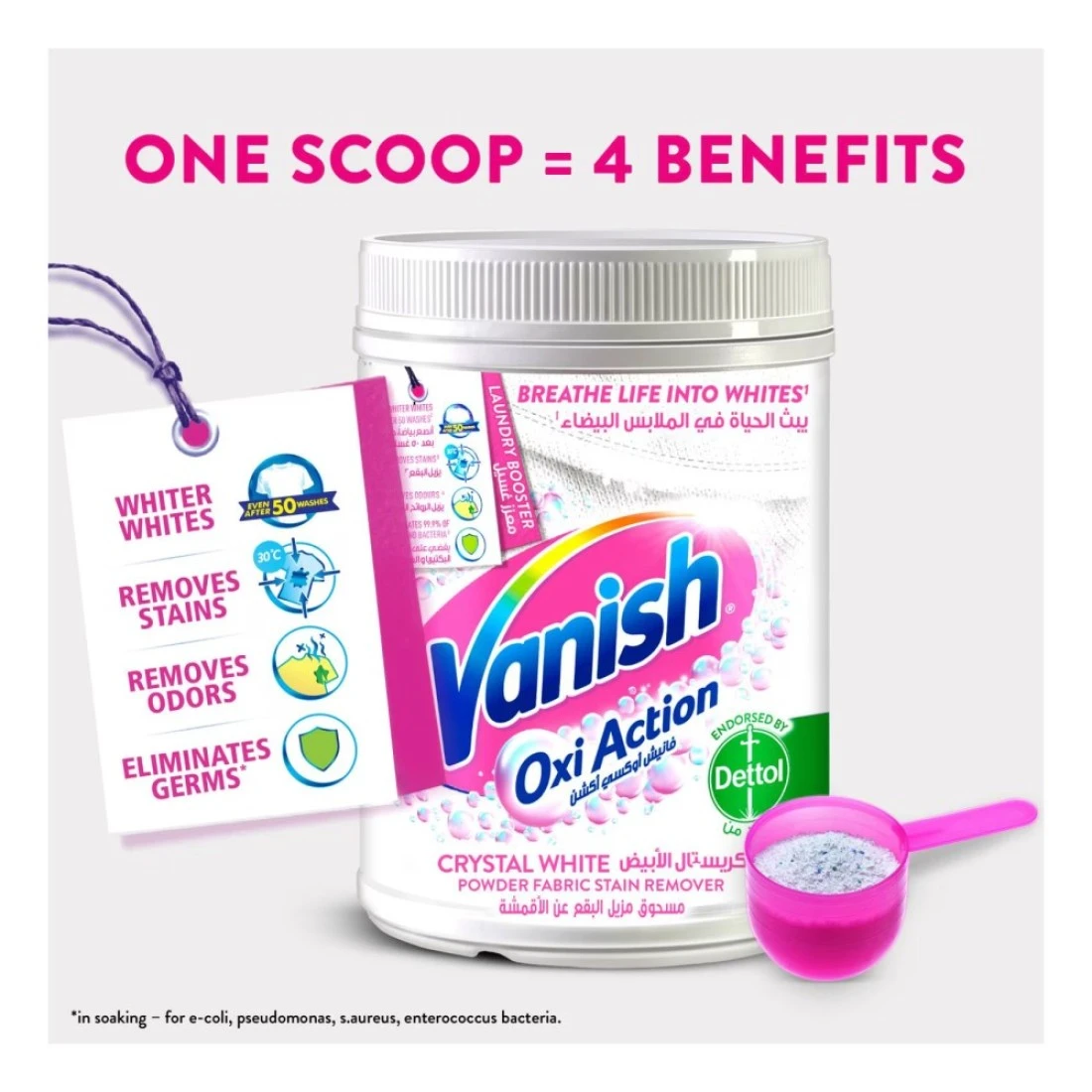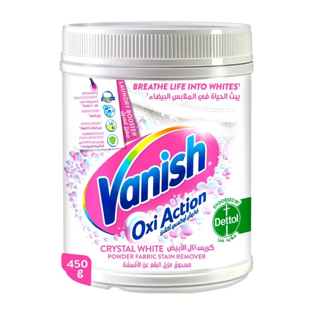 - Breathe life into whites! Vanish oxi action crystal white stain remover powder is specially designed to give you amazing stain removal results and keep your whites whiter even after 50 washes