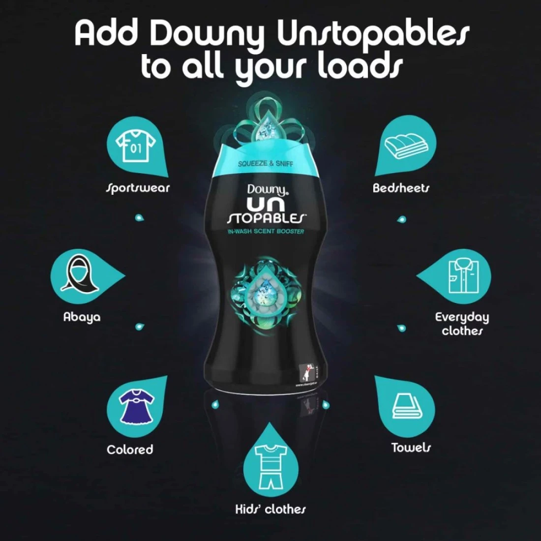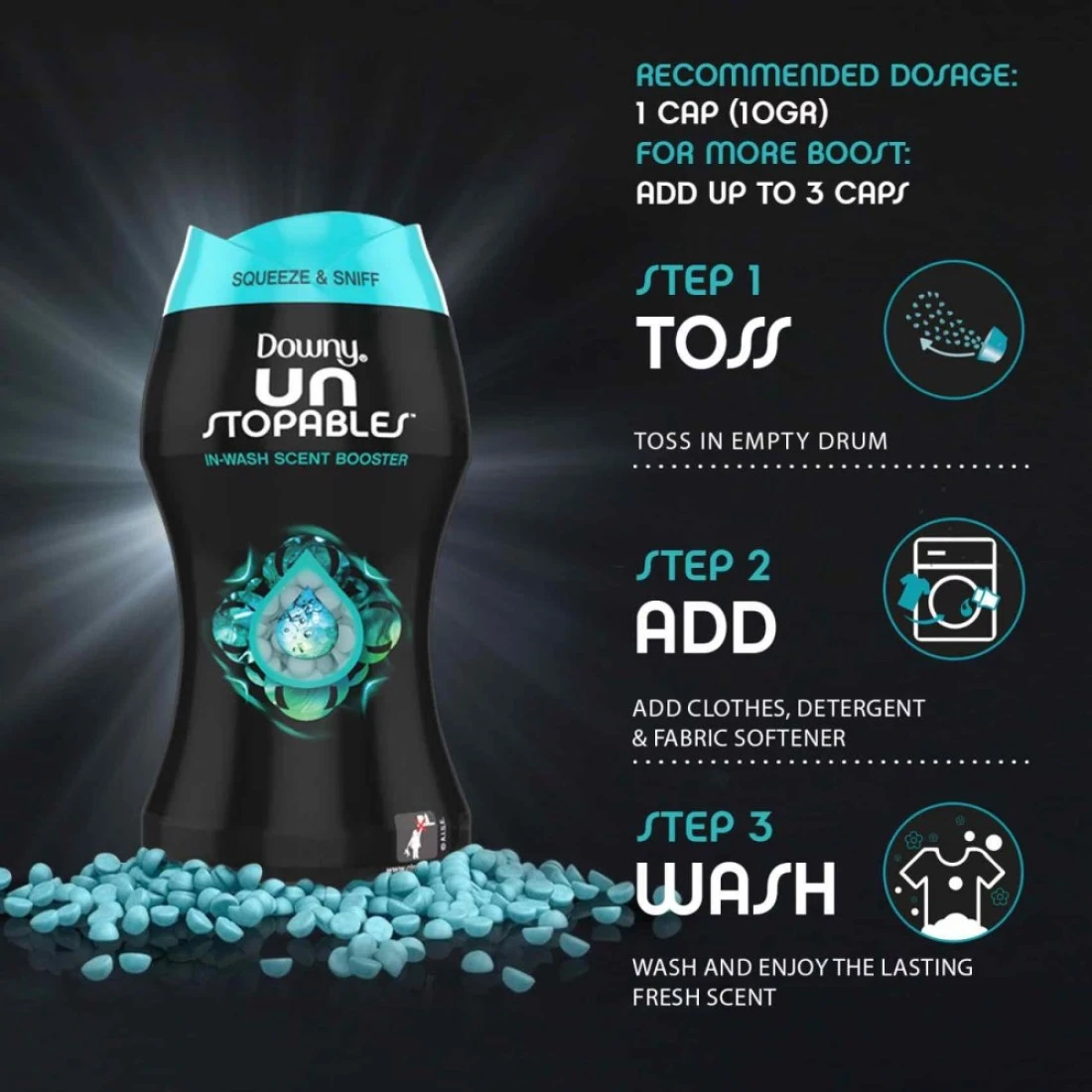 Downy Spring UNSTOPABLES In-Wash Scent Booster beads go directly into your washing machine to give you fantabulous freshness that keeps up to 12 weeks (in storage) so your clothes are always ready to wear infused with your favourite scent. You will enjoy its marine smell invigorated with a green citrus aroma and sweet soapy back notes. Recommended dosage: 1 cap (10gr)For more boost: up to 3 caps Step 1: Toss Downy Unstoppables In-Wash Scent Booster in your empty washing machine step 2: Add clothes detergent and fabric softener step 3: Choose your cycle-wash and enjoy the lasting fresh scent