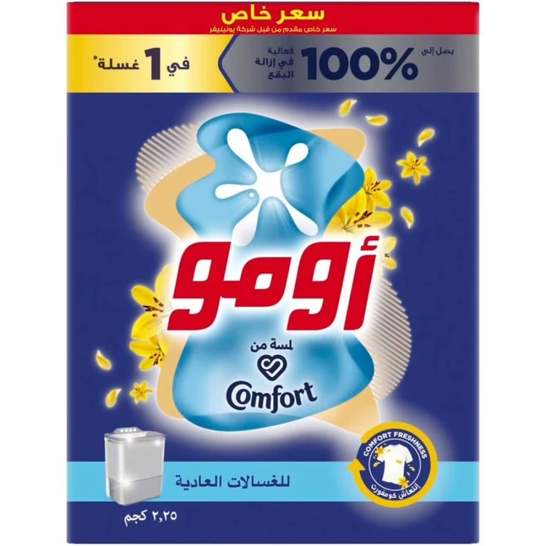 OMO Active Laundry Detergent Powder, now in a fresh new look, and a new advanced formula. OMO Active Powder provides up to 100% stain removal in just one wash*, formulated specifically to tackle the toughest stains. Its advanced new formula targets the root of the stain, dissolving rapidly and penetrating fabric deeply to lift stains completely away. \\Enjoy a fresh and lasting fragrance with OMO Active Powder detergent, leaving your clothes smelling clean for longer For anti-bacterial action wash clothes at least 45 minutes. For best laundry results use OMO & Comfort. Always check the articles care label and rollow the washing instrutions.\Explore the full range of OMO Powder Laundry Detergents, including OMO Touch of Comfort for a fresh fragrance, OMO Sensitive for delicate skin, and OMO Black for Abayas and black fabrics. With OMO Active Laundry Detergent Powder, you get a powerful clean, lasting freshness, and a variety of options to suit your laundry needs.\\Safety warning; Do not swallow. Rinse and dry hands thoroughly after use, Keep out of reach of children. Avoid contact with eyes. In case of contact with eyes, rinse immediately with water. People with sensitive or damaged skin should avoid prolonged contact with the wash solution, if the contact occurred please contact a doctor immediately. The use of gloves is recommended to prevent any unwanted problems.\\\*Based on stain removal test results on fatty, enzymatic, bleachable and particulate stain