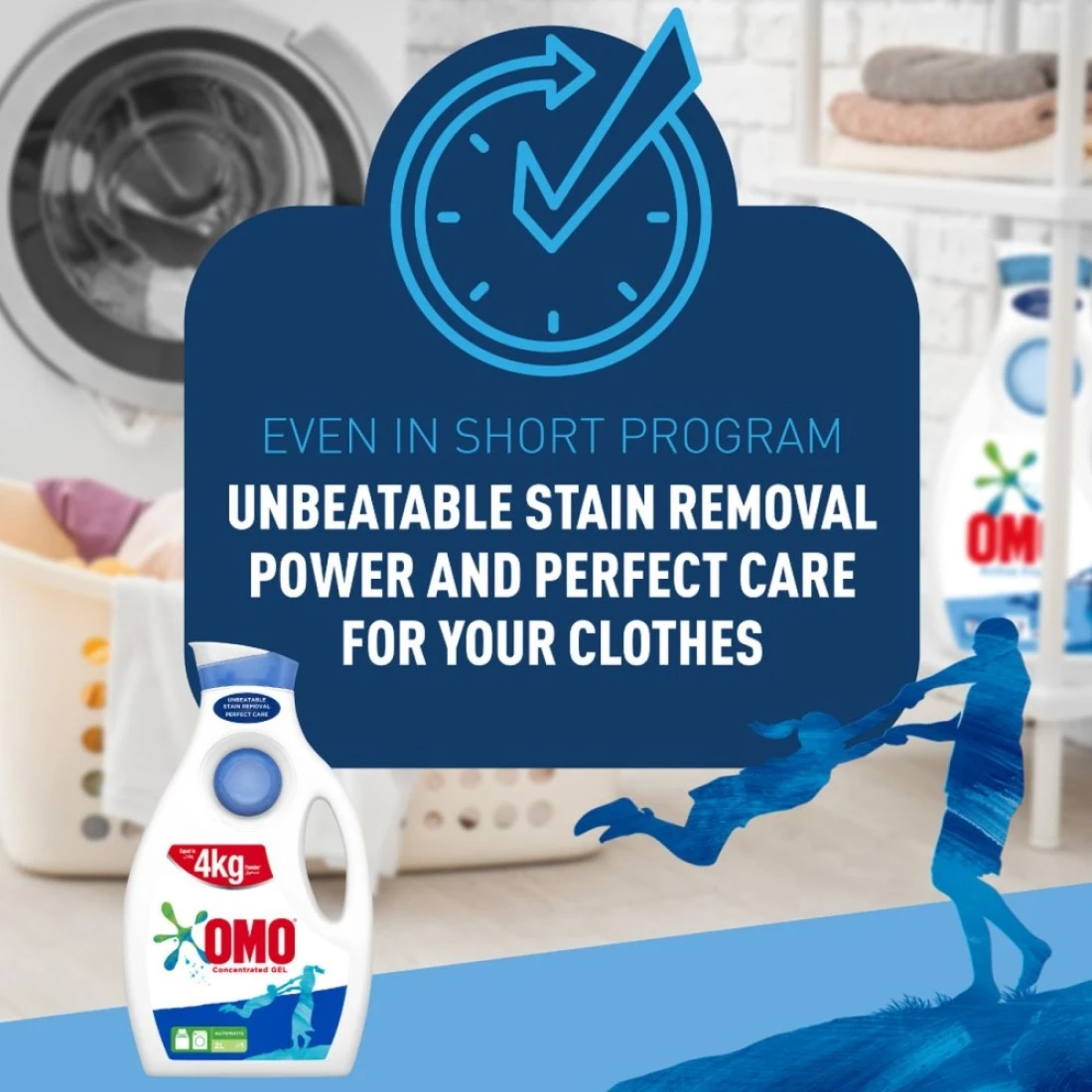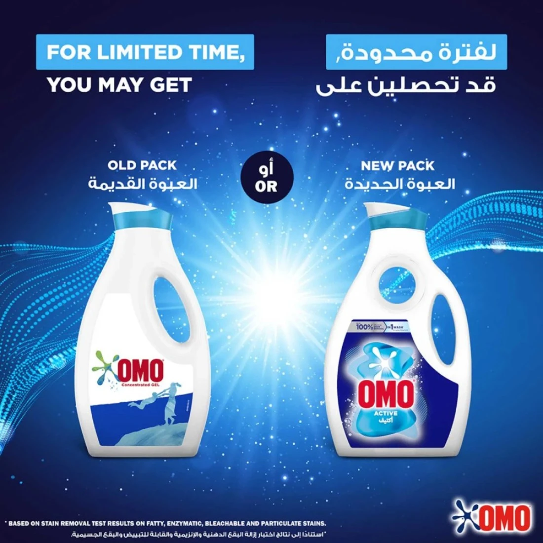 OMO Active Liquid Laundry detergent, now in a fresh new look. OMO Active Liquid provides up to 100% stain removal in just one wash*, formulated specifically to tackle the toughest stains. Its advanced new formula targets the root of the stain, dissolving rapidly and penetrating fabric deeply to lift stains completely away. \\Enjoy a fresh and lasting fragrance with OMO Active Liquid detergent, leaving your clothes smelling clean for longer For anti-bacterial action wash clothes at least 45 minutes. For best laundry results use OMO & Comfort. Always check the articles care label and follow the washing instructions.\Explore the full range of OMO Liquid Laundry Detergents, including OMO Touch of Comfort for a fresh fragrance, OMO Sensitive for delicate skin, and OMO Black for Abayas and black fabrics. With OMO Active Laundry Detergent Liquid, you get a powerful clean, lasting freshness, and a variety of options to suit your laundry needs.\\Safety warning; Do not swallow. Rinse and dry hands thoroughly after use, Keep out of reach of children. Avoid contact with eyes. In case of contact with eyes, rinse immediately with water. People with sensitive or damaged skin should avoid prolonged contact with the wash solution, if the contact occurred please contact a doctor immediately. The use of gloves is recommended to prevent any unwanted problems.\\\*Based on stain removal test results on fatty, enzymatic, bleachable and particulate stain