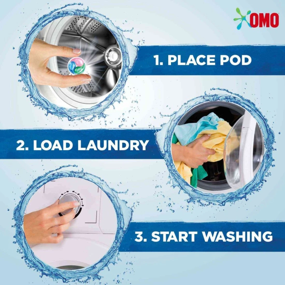 - Just pop the capsule in the back of the drum of your washing machine, add your laundry and let Omo laundry detergent do the work.