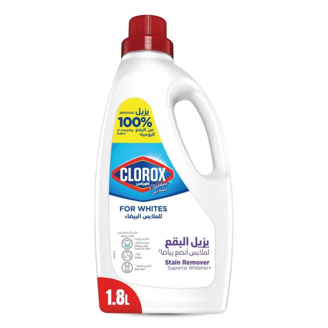 - SUPREME WHITENER: Clorox Clothes for whites is ideal for your white clothes & your whites with a touch of color, thobes and delicates, keeping your whites bright.