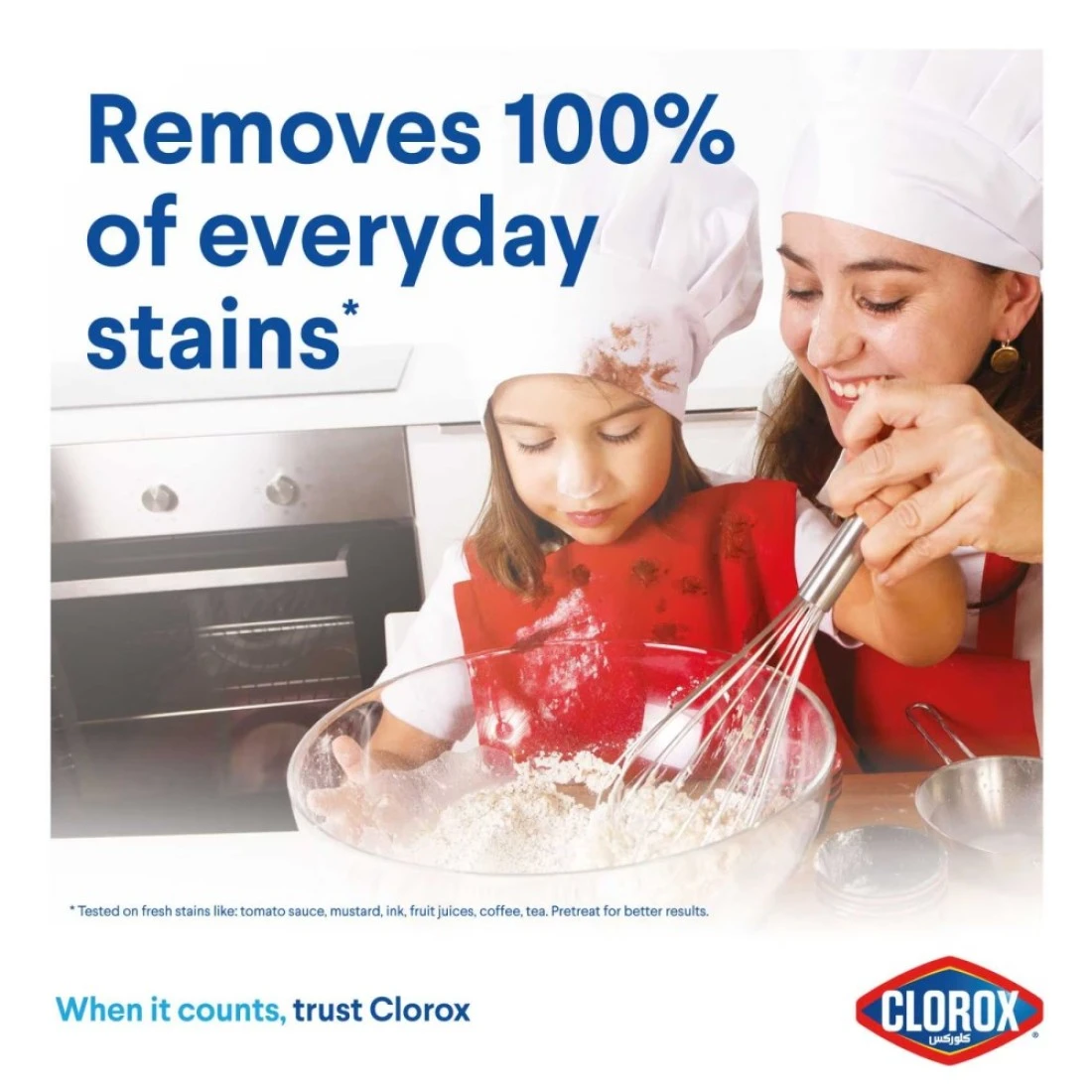 - SUPERIOR STAIN REMOVAL: Use Clorox Clothes for Whites with your detergent to remove greasy stains as well as coffee, tea, ketchup and fruit juice. It removes 100% of everyday stains. It is also safe on sensitive washable fabrics like silk and wool.
