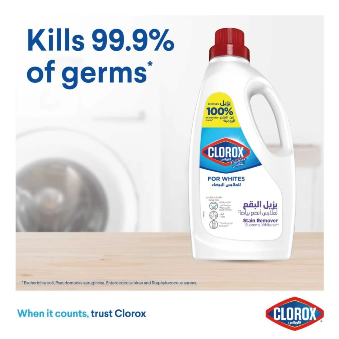 - LAUNDRY DISINFECTION: Clorox Clothes not only removes stains and provides your laundry with supreme whitening, but it also kills 99.9% of germs (Add 100 ml (2 caps) of Clorox Clothes to 4L of warm water (38°C). Soak for 4 hours then wash as usual)