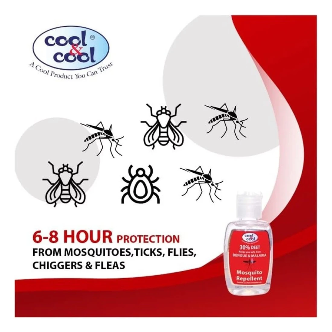 Cool & Cool Mosquito Repellent Gel with 30% DEET provides you with up to 6-8 hours of protection against mosquitos, ticks, flies, chiggers and fleas. This water-based formula is effective while absorbing less & staying for longer on your skin.
