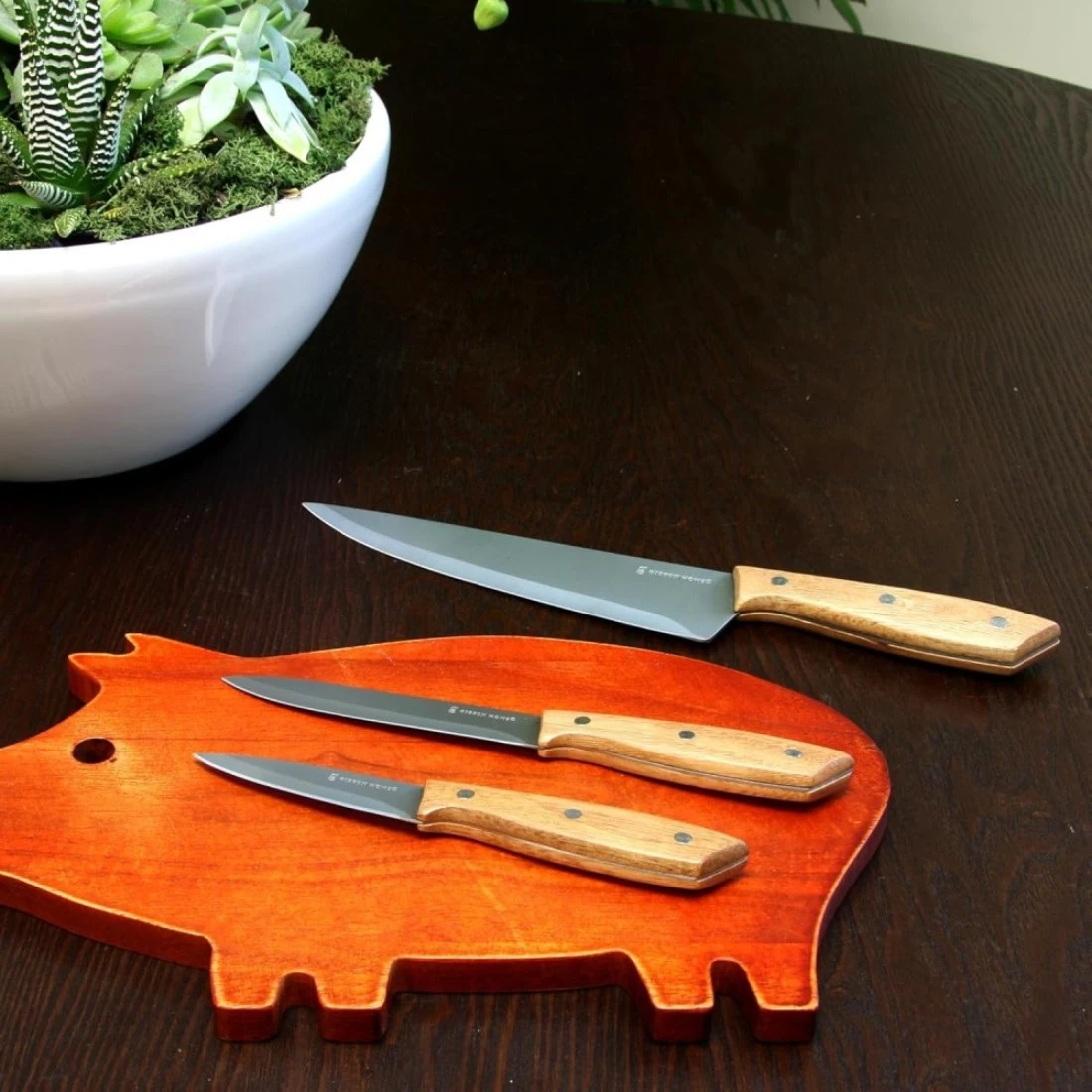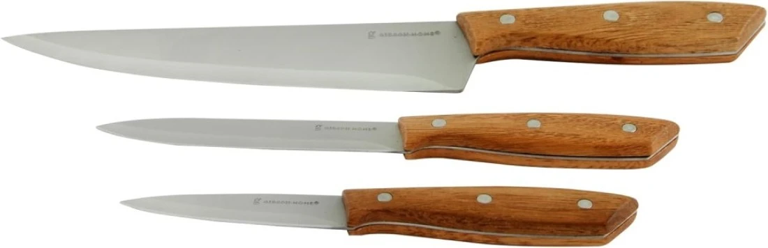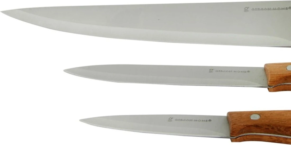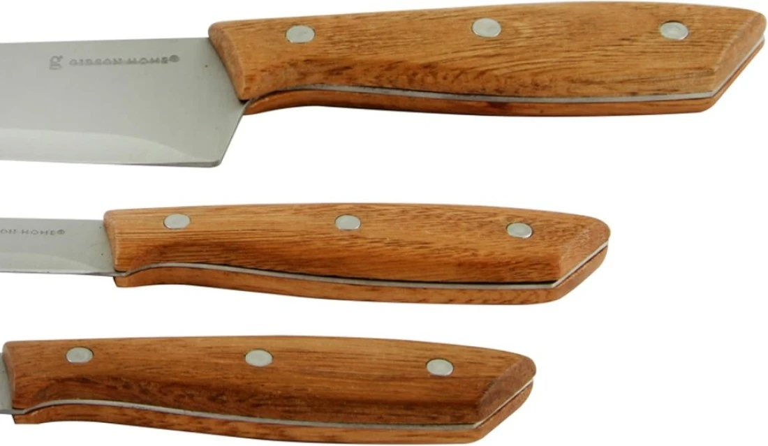 Tackle meal prep with the pieces in this Gibson Home Seward Cutlery Set. The 3-piece set features sharp and strong stainless-steel blades, while the triple-riveted wood handles offer a comfortable grip and a timeless appearance.
