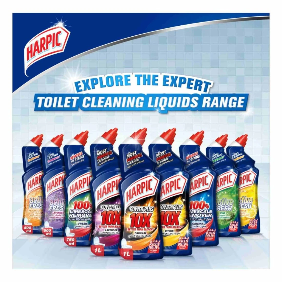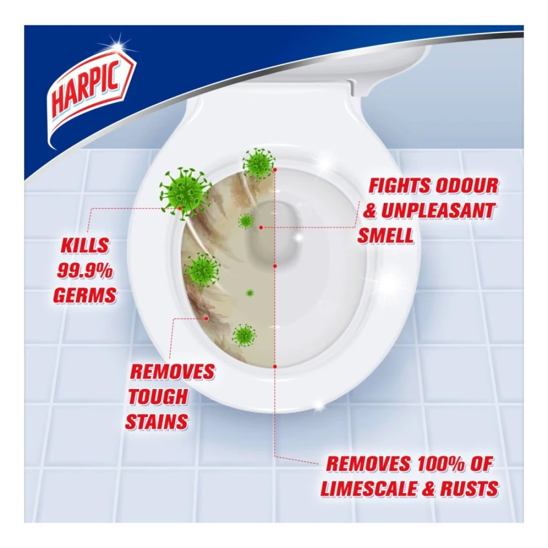 - Enjoy long-lasting freshness and a touch of cleanliness with Harpic toilet cleaner as it removes all tough stains cleans above and below the waterline leaving your bathroom with a pleasant pine fragrance and a fresh look
