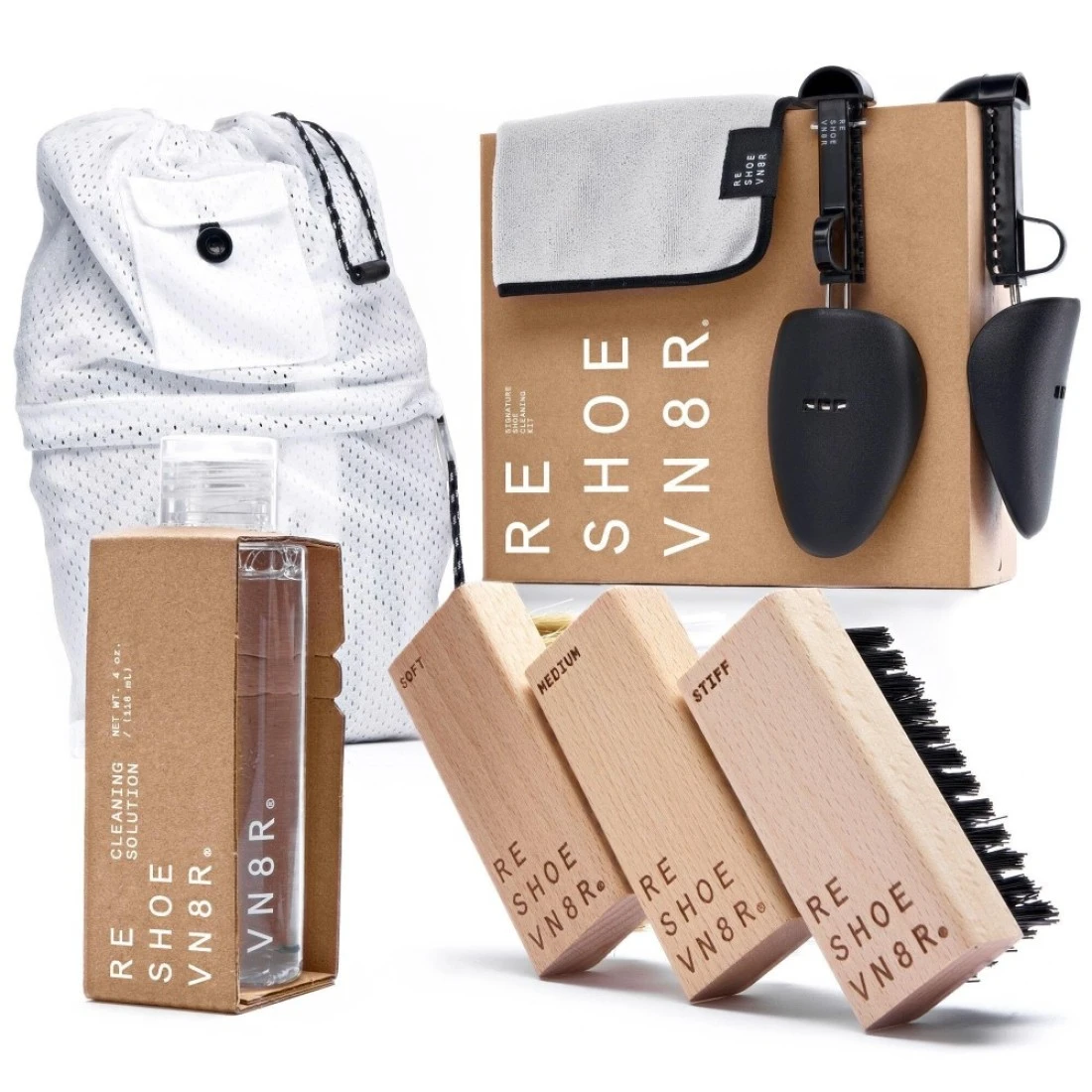 RESHOEVN8R Signature Shoe Cleaning Kit: Our flagship Signature Kit is what separates us from the rest. It’s the best of both worlds, containing everything you need to treat your shoes with our brush system AND wash them in the washing machine with the patented RRESHOEVN8R Laundry System., Everything You Need for an Effective Clean: Our Signature Kit includes a 4 oz. bottle of our Cleaning Solution, a Soft Bristle Brush, a Medium Bristle Brush, a Stiff Bristle Brush, a Sneaker Laundry Bag, 2 washable Shoe Trees, and a machine washable Microfiber Towel., Directions: Adjust Shoe Trees to size and insert into shoes. Fill a bowl with 4 oz of water and add a small amount of Cleaning Solution. Dip the appropriate brush into the mixture and scrub shoes clean. Wipe with the Microfiber Towel, place shoe soles together and fasten in the Laundry Bag. Insert a Laundry Pod into the pouch and machine wash using COLD water. Remove shoes from the bag and air dry., Only The Best: Our Cleaning Solution is made with 100% natural ingredients and is safe to use on almost any material. No harmful additives, chemicals, or dyes just concentrated clean., Elevate Your Shoe Care: Established in Arizona in 2010, Reshoevn8r has become the leader in shoe care innovation, delivering the most extensive and effective shoe care products on the market. Our mission is to help people look and feel their best by providing that new shoe feeling after every clean.