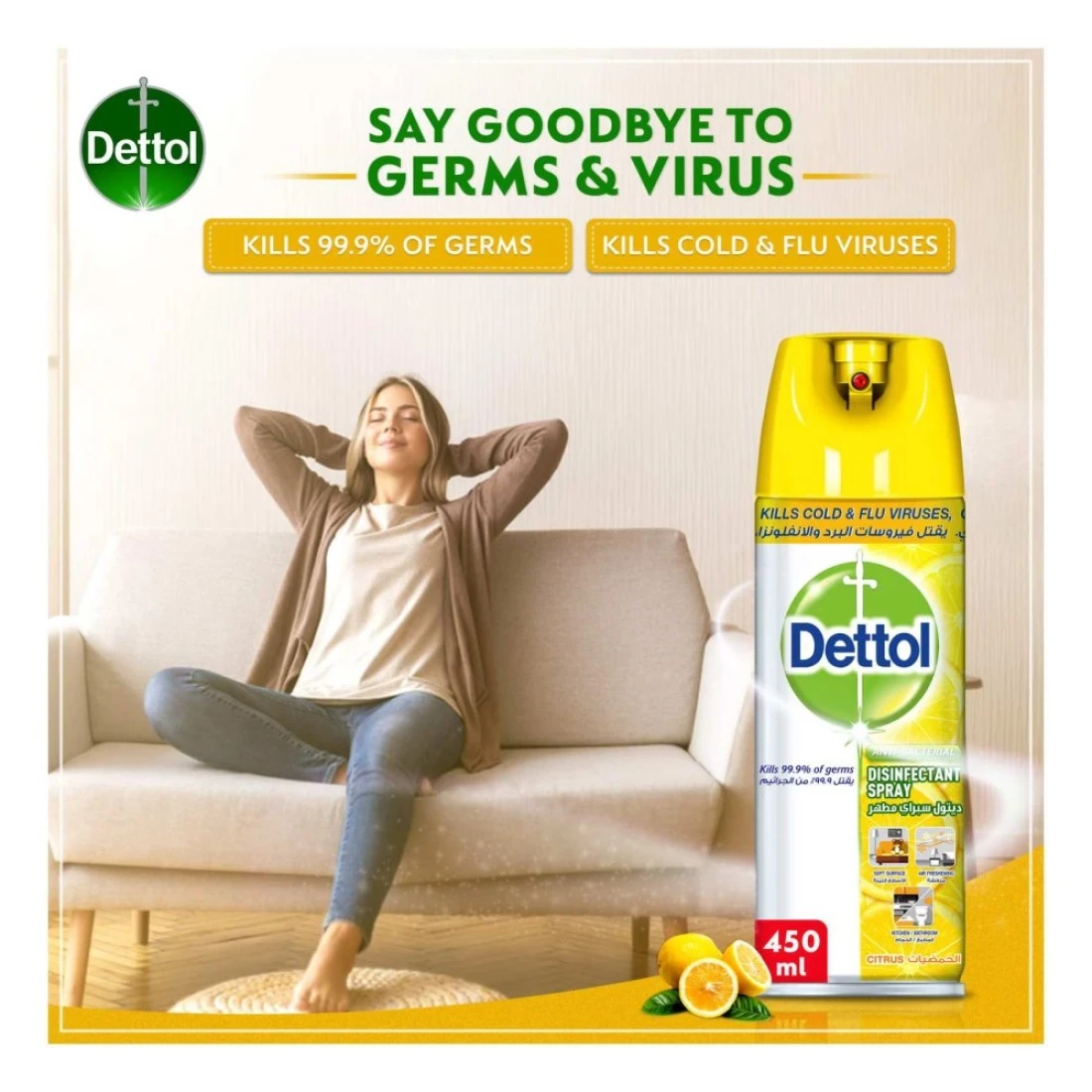 - Safeguard your family from cold and flu viruses with Dettol antibacterial disinfectant spray, an all-in-one wet spray protecting against a wide range of bacteria, viruses, and fungi such as E-Coli, staphylococcus aureus, MRSA, adenovirus, influenza type a (h1n1), respiratory syncytial virus, salmonella, and listeria