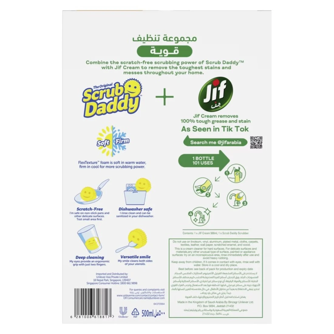 Household cleaning chore just found a new upgrade. Introducing the combined power and efficiency of Scrub Daddy’s Multipurpose Sponge and JIF’s Multipurpose Lemon Cream Cleaner. This dynamic duo is going to make your life better with its effortless cleaning power. While JIF’s all-purpose cleaning cream helps with 100% grease and stain removal, the smiling Scrub Daddy sponge scrubs and wipes away dirt from all surfaces and dishes, leaving your house looking sparkling clean. This all-in-one bundle is designed to help you clean everything in your house – bathroom, kitchen, floors, cabinets, furniture, doors, utensils – it’s the single most effective solution that will become a staple in your home for dirty dishes, surfaces and corners. It is the perfect kitchen & bathroom cleaner. The scratch-free sponge is also safe to use on non-stick pans and other delicate surfaces. It’s designed to clean both sides of your dishes. Made with FlexTexture technology, the sponge foam adapts based on water temperature, making it an easy choice for multipurpose cleaning. It’s soft in warm water, which is perfect for light cleaning, while it’s firmness in cold water makes it ideal for tough scrubbing. How to use: Cleaning was never this easy! All you need to do is to pour JIF cream on Scrub Daddy sponge, scrub the cream on the dirty surface or utensils, and rinse off for sparkling clean home. Just Jif and Scrub for spotlessly clean home and dishes.