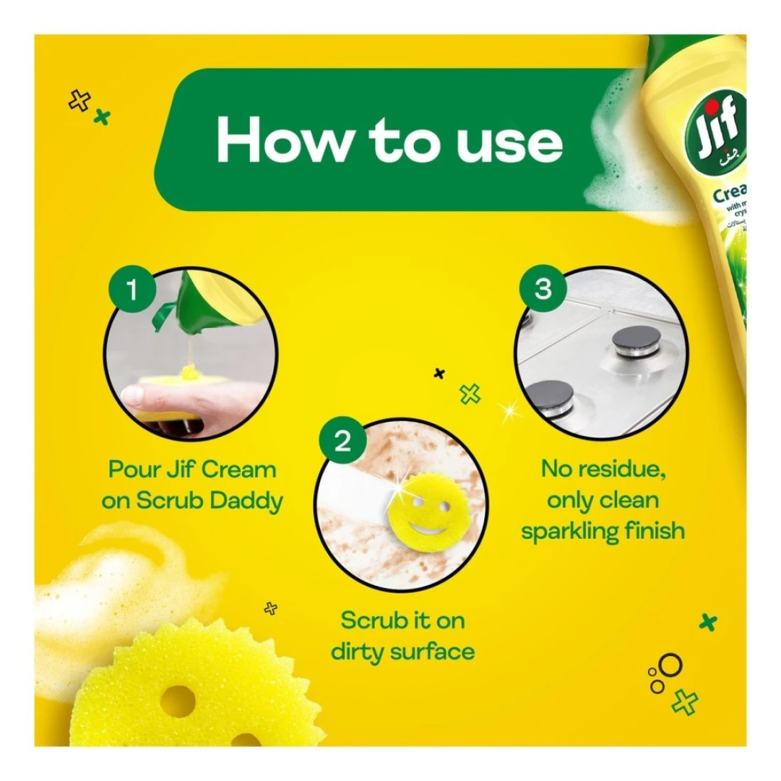 - Simply pour JIF cream on Scrub Daddy sponge, scrub the cream on the dirty surface or utensils, and rinse off for sparkling clean home