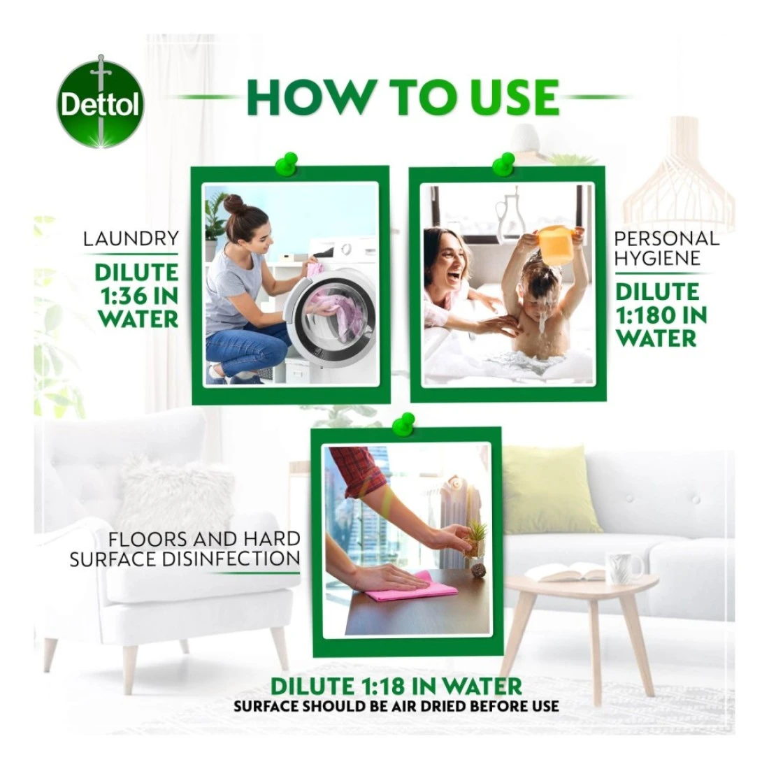 - This Dettol liquid protects against infection from cuts, scratches, and insect bites and can also be used as a household disinfectant on surfaces or the laundry
