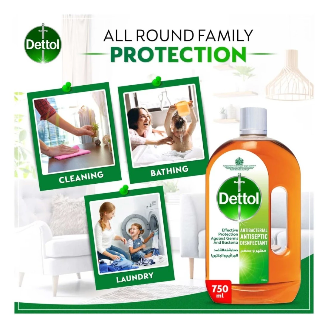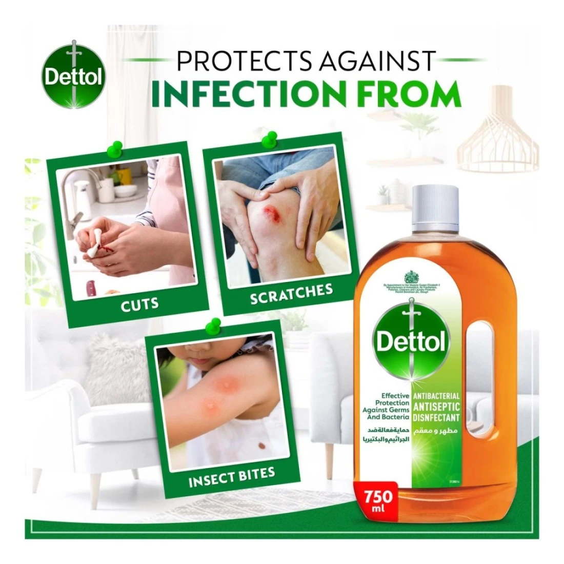 - This Dettol liquid protects against infection from cuts, scratches, and insect bites and can also be used as a household disinfectant on surfaces or the laundry