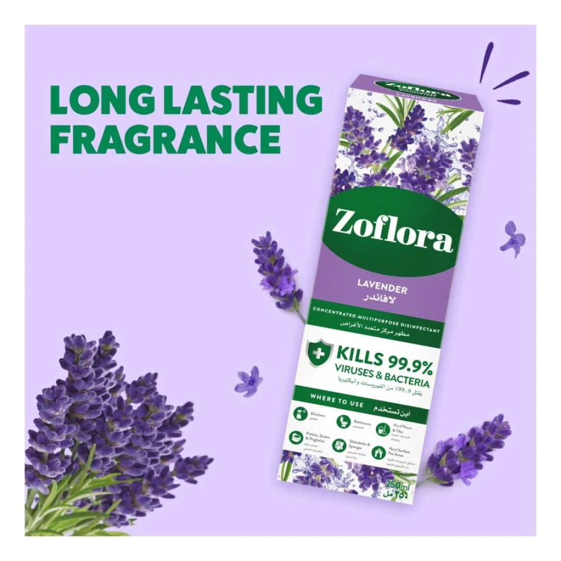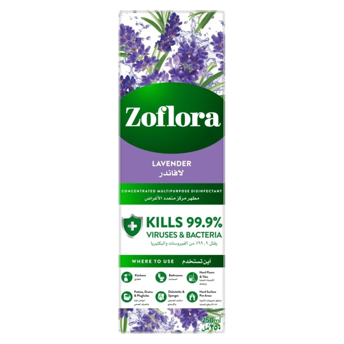 Zoflora Concentrated Multipurpose Disinfectant Lavender 250ml is a versatile cleaning product that effectively kills 99.9% of bacteria and viruses. It has a pleasant scent that leaves your home smelling fresh and clean. This concentrated formula can be used to clean a variety of surfaces, including floors, countertops, and toilets. It is also safe to use around pets and can be diluted to create a fragrant air freshener.