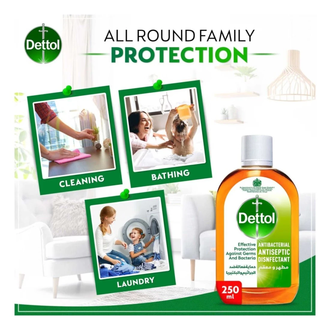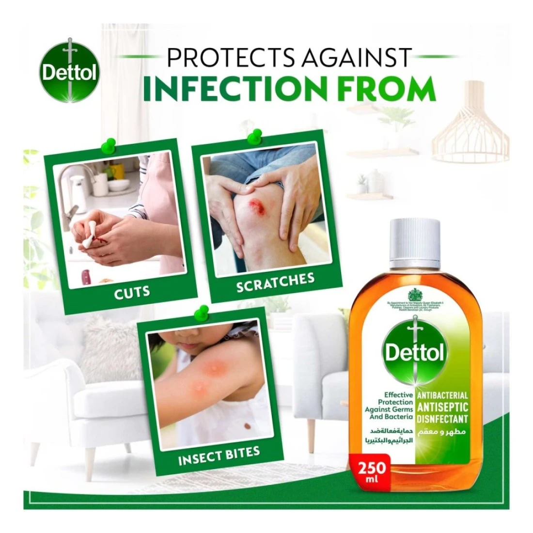 - This Dettol liquid protects against infection from cuts, scratches, and insect bites and can also be used as a household disinfectant on surfaces or in the laundry