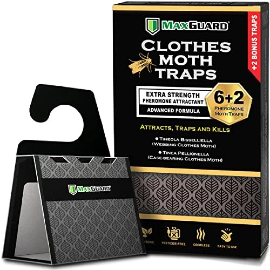 MaxGuard Clothes Moth Traps (6+2 Free Traps) with Extra Strength Pheromones Non-Toxic Sticky Glue Trap for Closets and Carpet Moths No Mothballs Lure, Trap and Kill Case-Bearing Webbing Moths