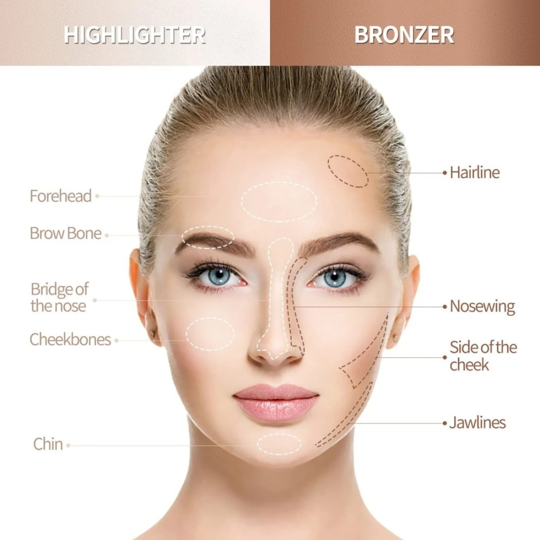 1. Apply highlight stick on cheekbones, middle of forehead, under eyes, down the center of your nose, on the brow bone and along the jawline.