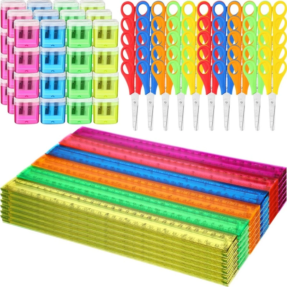 Sayglossy 150 Pcs School Supplies Kit for Kids Include 50 Pcs 12 Inch Plastic Rulers 50 Pcs Student Scissors 50 Pcs Pencil Sharpeners for Classroom School Office Desk Accessories, Multicolor