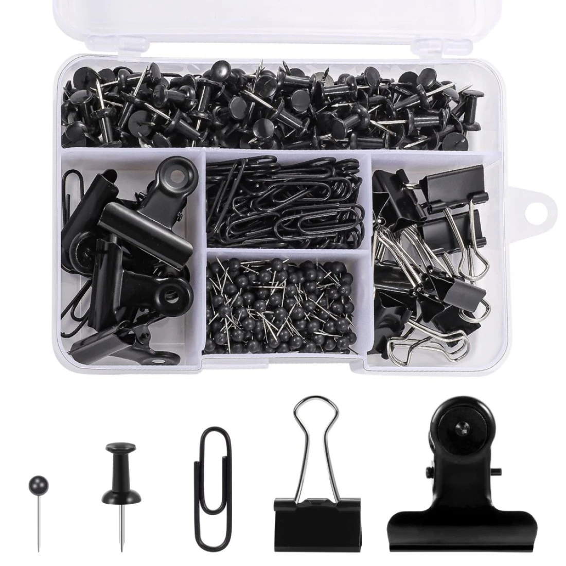 ã€Package Contents】You will get 500 pcs black push pins binder clips paper clips map tacks sets, including 14 black binder clips, 6 pushpin clips, 80 black paper clips, 100 black pushpins, 300 round map pins, enough for everyday use., ã€Easy to Use】The black thumb tacks is inserted directly into the cork board and will not fall off. It is suitable for bulletin boards and maps to important information. The black binder clips and paper clips are easy to open and close, suitable for storing papers, notes, photos, etc, ã€Excellent Material】The cute push pins set is made of high quality sturdy plastic and metal materials, durable and not easy to fade, comes packaged in a 5-compartment clear plastic box, easy access and storage, ã€Wide Applications】You can use these pushpin binder sets to pin your notes, photos, posters, memos, maps, calendars and more to corkboard, which suitable for many occasions, such as office, business, school, home, ã€Size Details】The size of the black binder clips is 1.33*0.74 inches, the size of the pushpin clip is 1.22inch, the length of the nail is 0.35 inches, the size of the black pushpin is 0.9inch, the size of the black paper clip is 1.1 inches, map pin size is 0.59 inches, ball diameter is 0.16 inches