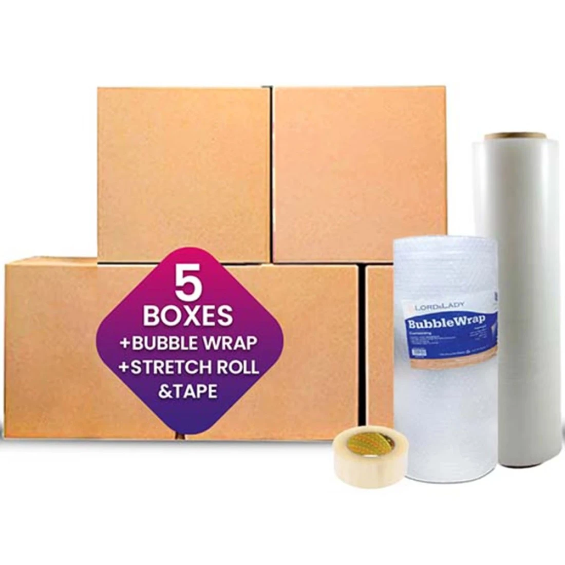 Generic Recyclable Corrugated Cardboard Boxes, Brown Carton Packaging 5 Box With Bubble Wrap, Stretch Roll & Tape Bundle Offer Packing Set Of 8 Items, 58x58x78 cm