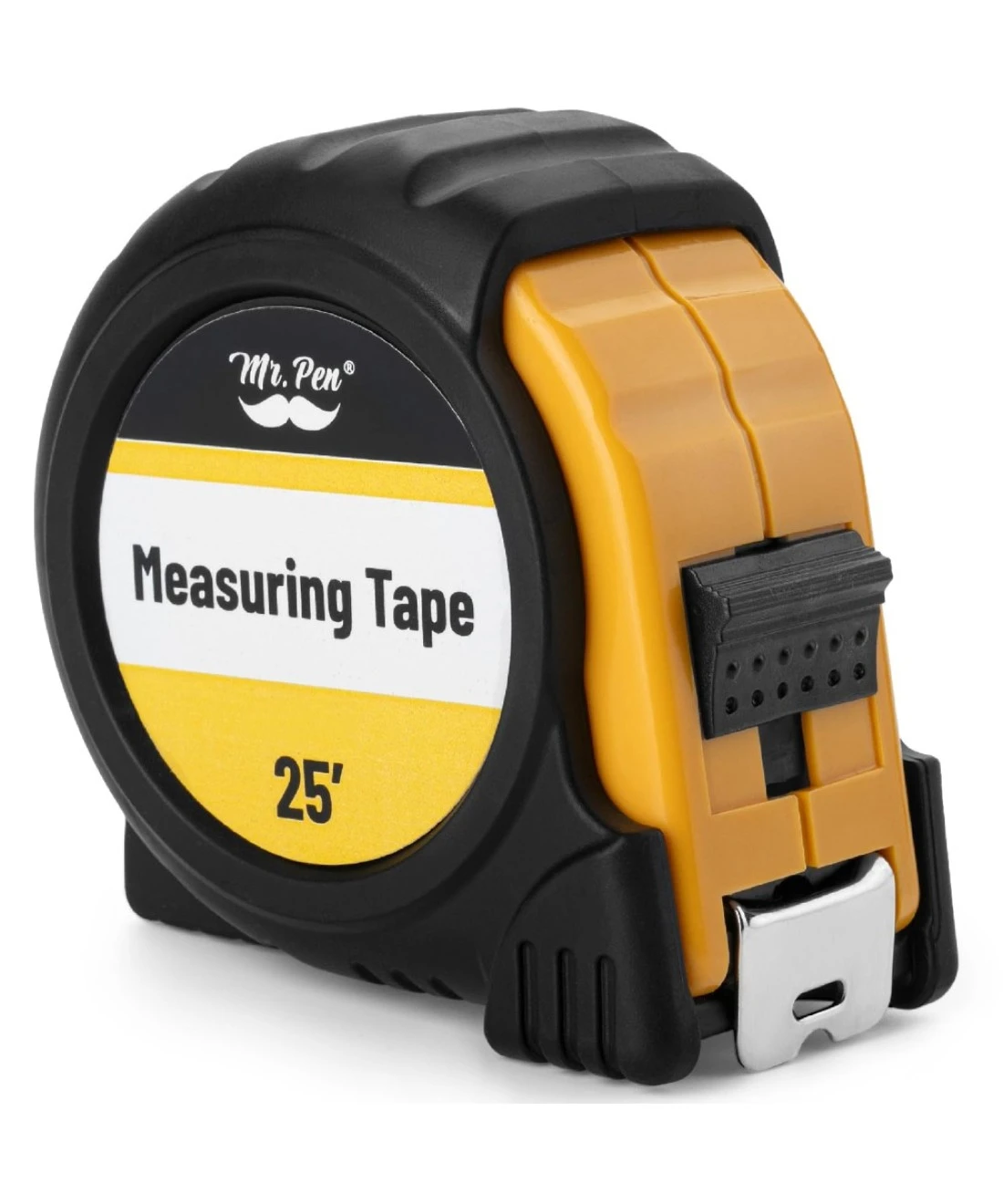Mr. Pen tape measure is engineered for durability with a sturdy case and a 25-foot steel tape, ideal for the toughest measuring jobs., It features easy-to-read fractional markings, ensuring precise measurements for both professional and home use., The tape measure is designed with an ergonomic grip, making it comfortable to hold and use over extended periods., A convenient locking mechanism keeps the tape extended at your desired length, enhancing stability and accuracy when taking measurements., Whether it's for construction, carpentry, or DIY projects, this tape measure provides the reliability you need to get the job done right.