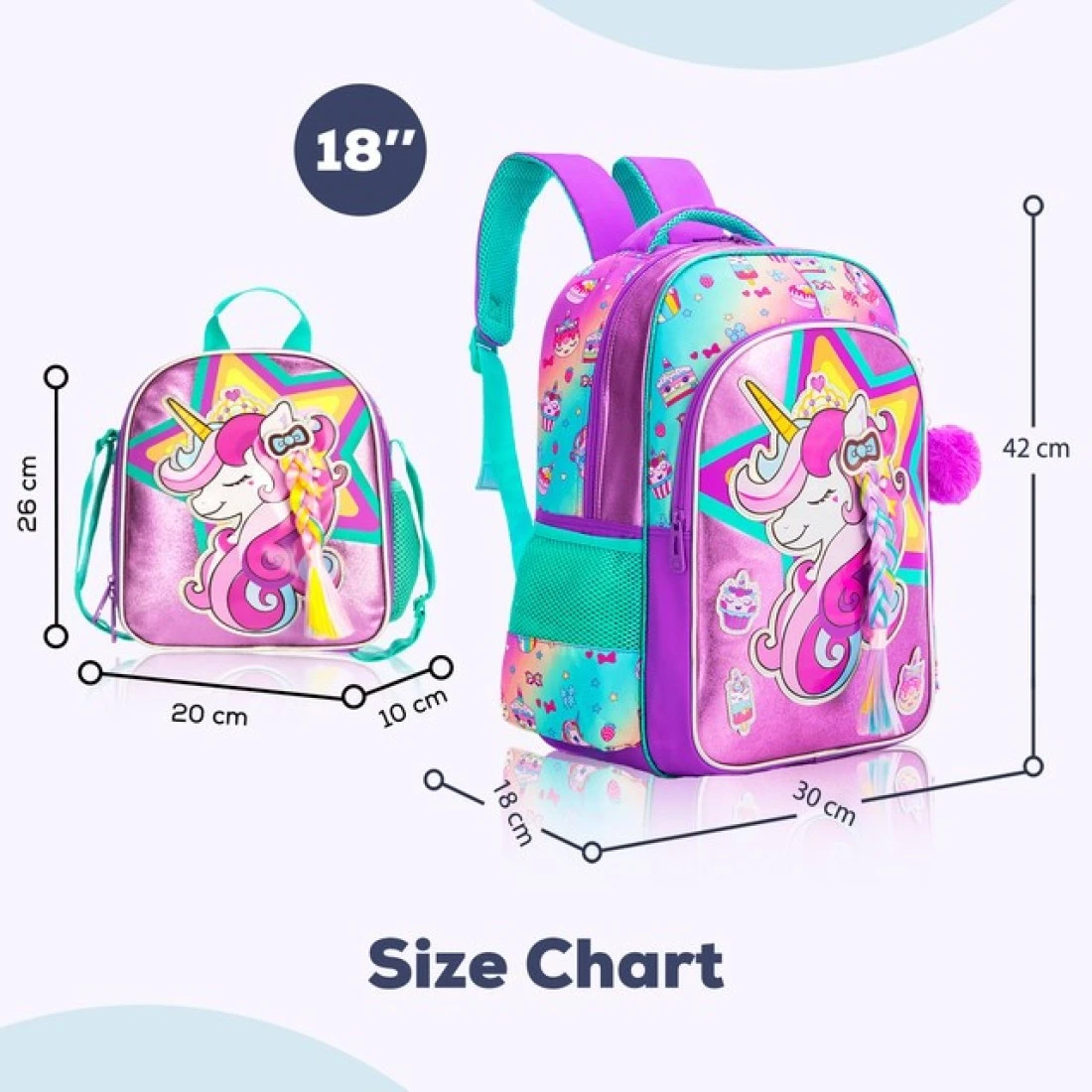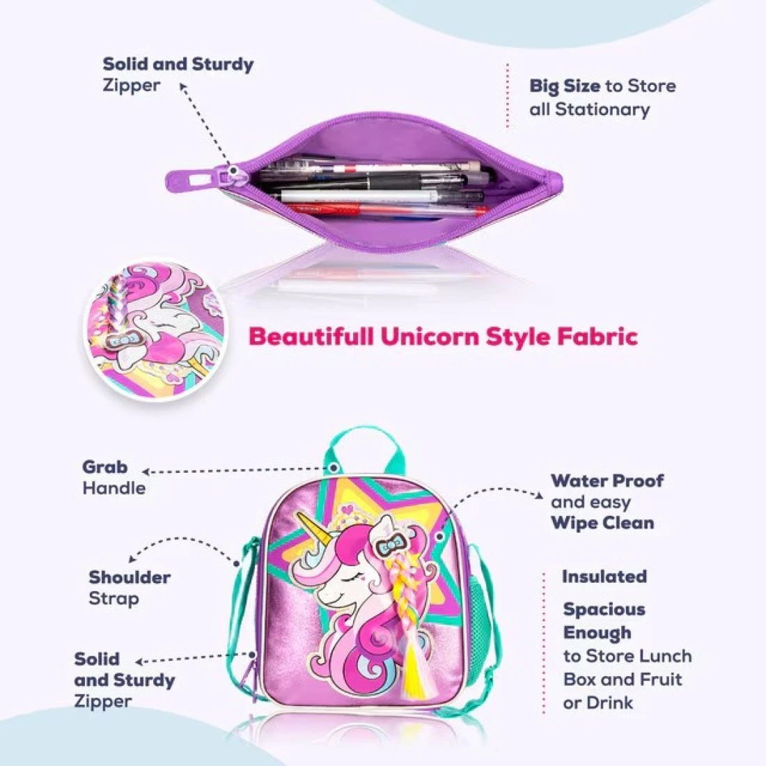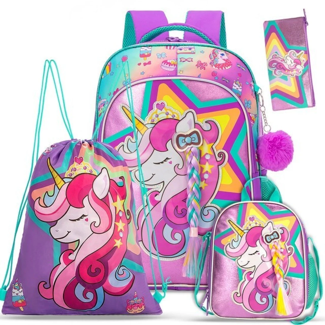 • 4 in 1 Unicorn Backpack : You will get 1 backpack, 1 Drawstring Bag, 1 Lunch box, 1 Pencil case and 1 pendant.