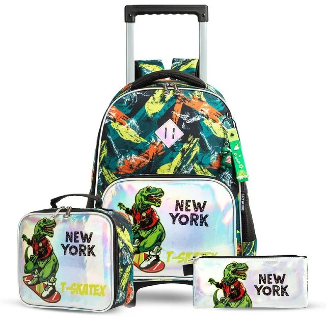 Eazy Kids - 16" Set of 3 Trolley School Bag Lunch Bag & Pencil Case New York Dinosaur - Green