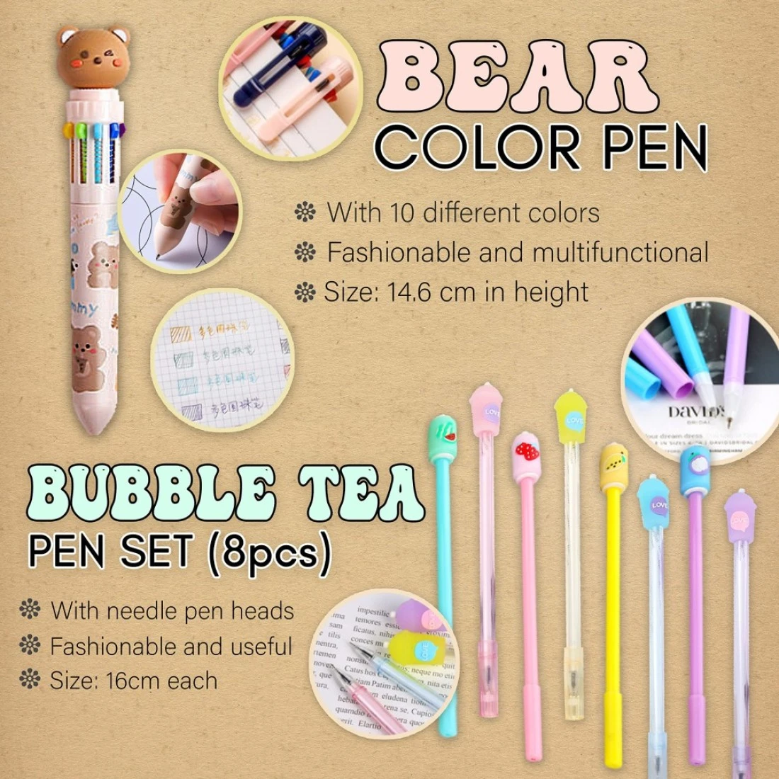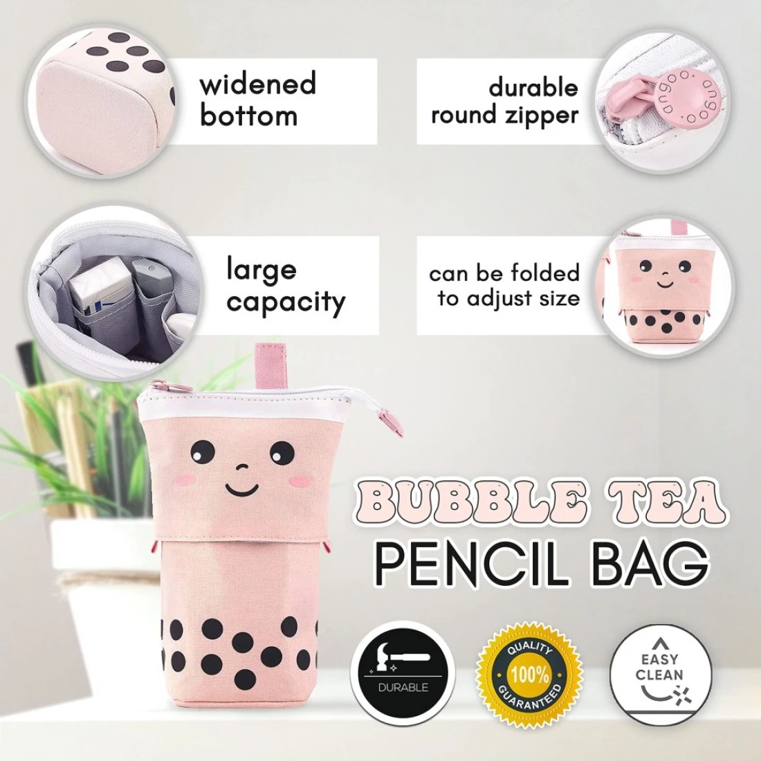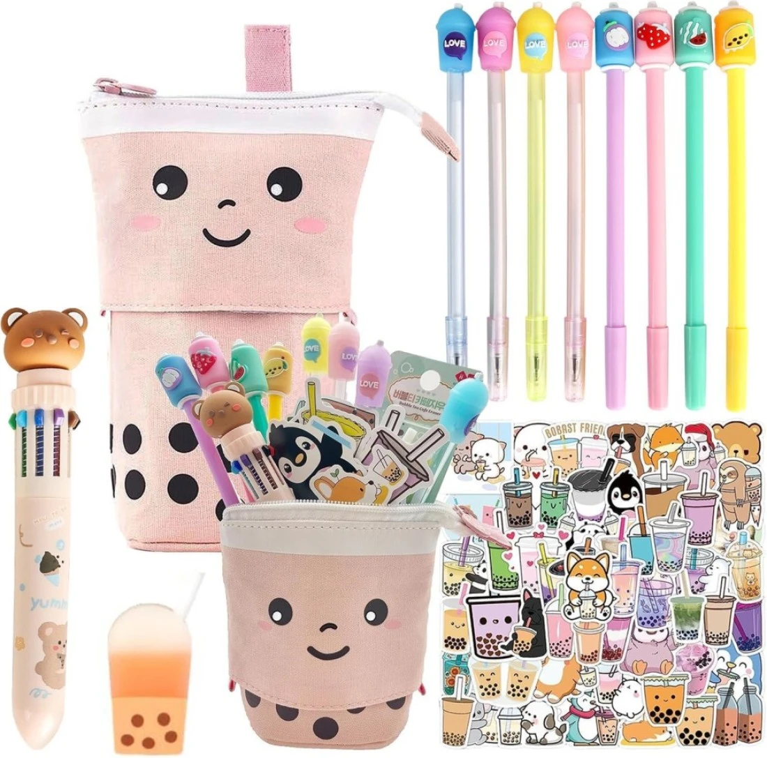 Primo Lines Kawaii Pencil Case and Complete 61 PCS Pink Stationary Set with Pop Up Cute Boba Case 8 Pens 50 Bubble Tea Stickers Multi Color Pen For School Supplies