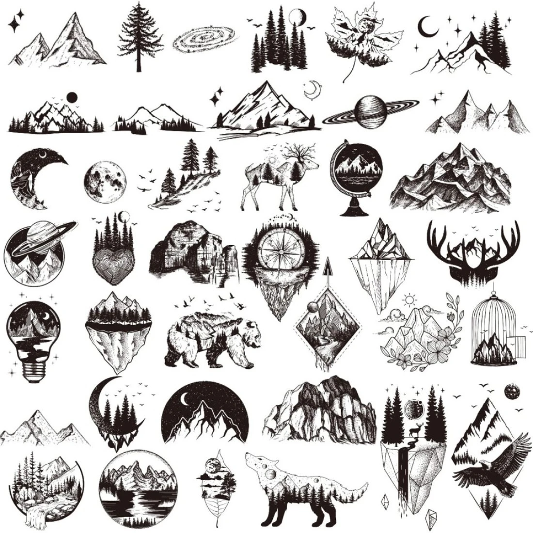 Ooopsiun 30 Sheets Small Black Mountain Planet Temporary Tattoos for Men Women - Unique Realistic Waterproof Forest Triangle Designs Body Art Tattoos for Adults